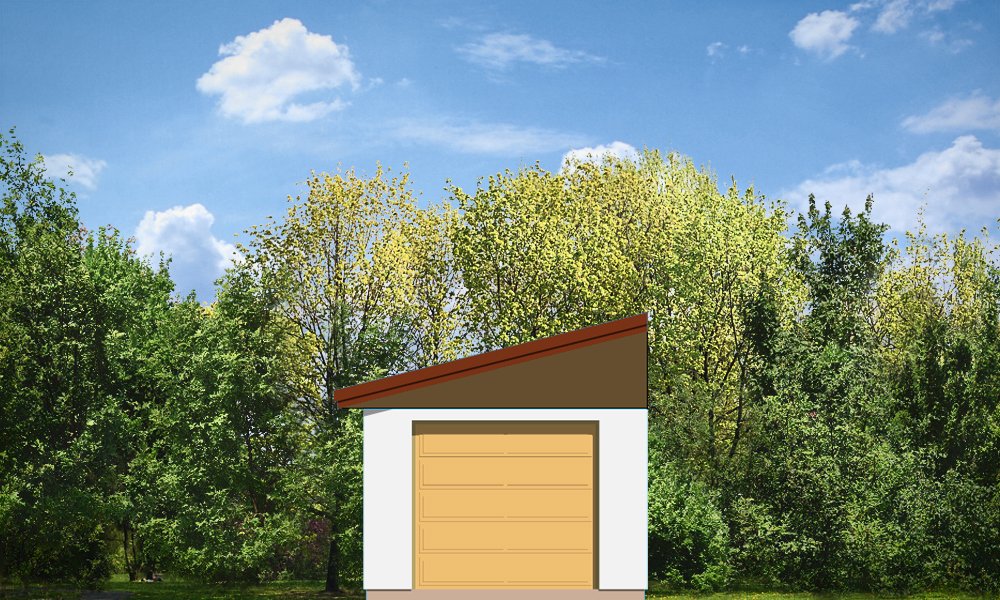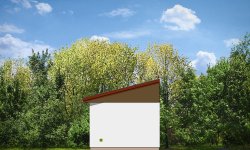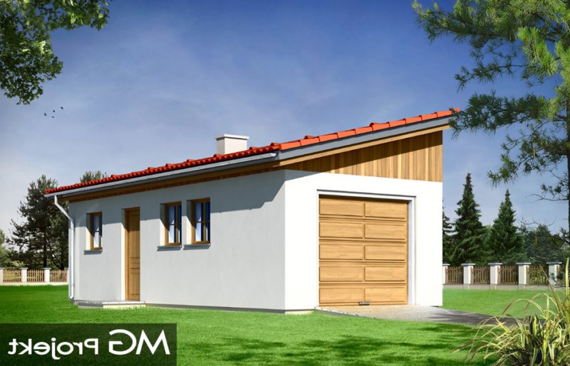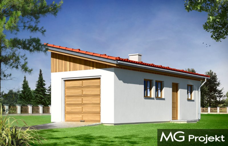 Garaż jednostanowiskowy z pomieszczeniem gospodarczym przykryty dachem jednospadowym z dodatkowym wyjściem od strony elewacji bocznej.