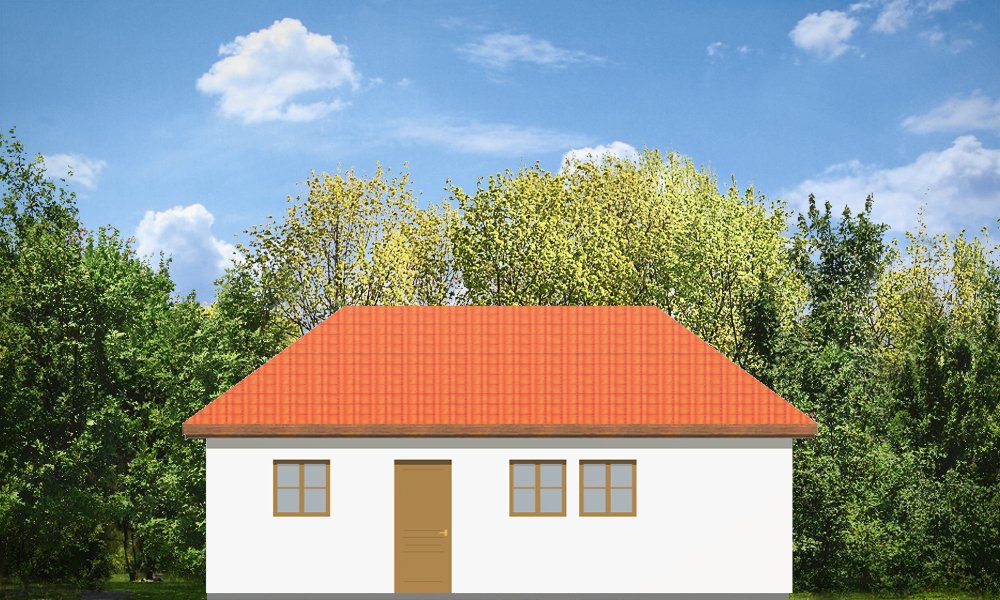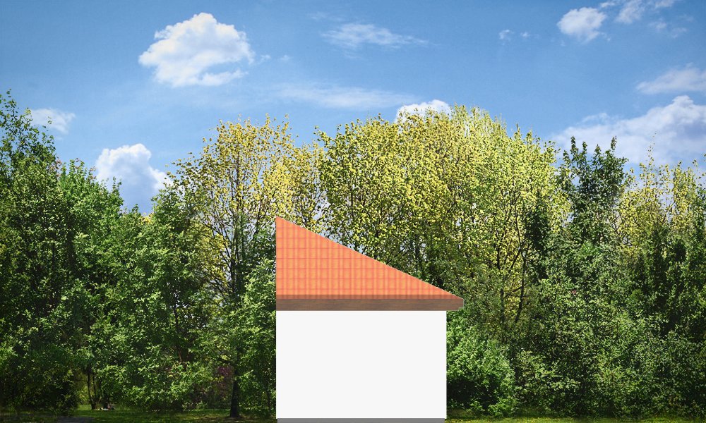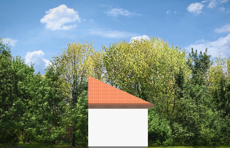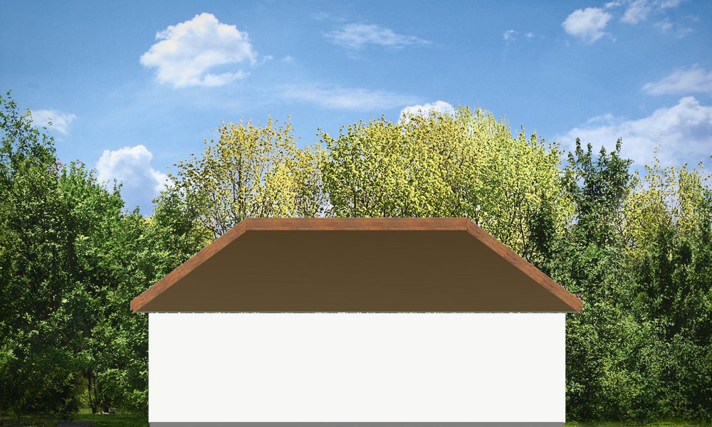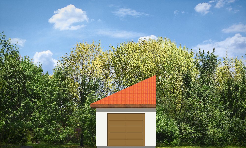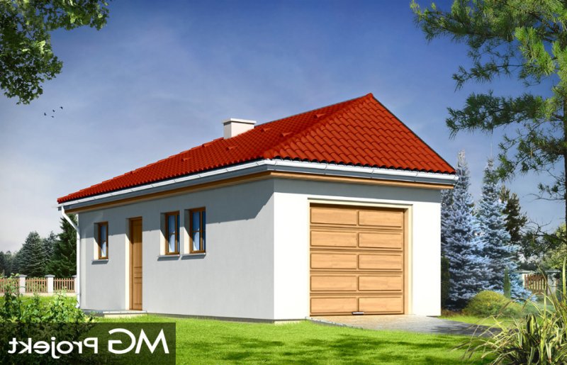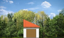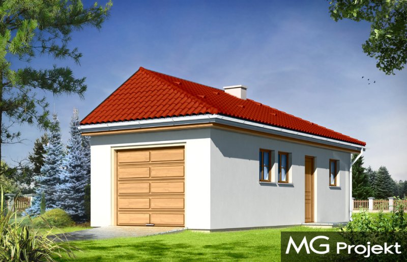 Garaż jednostanowiskowy z pomieszczeniem gospodarczym przykryty dachem wielospadowym z dodatkowym wyjściem od strony elewacji bocznej.