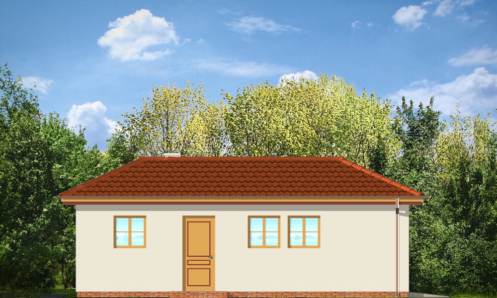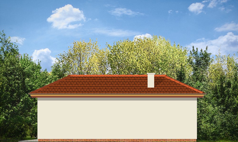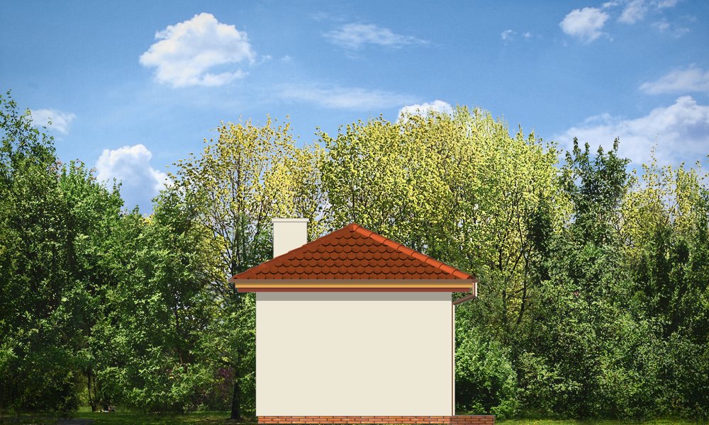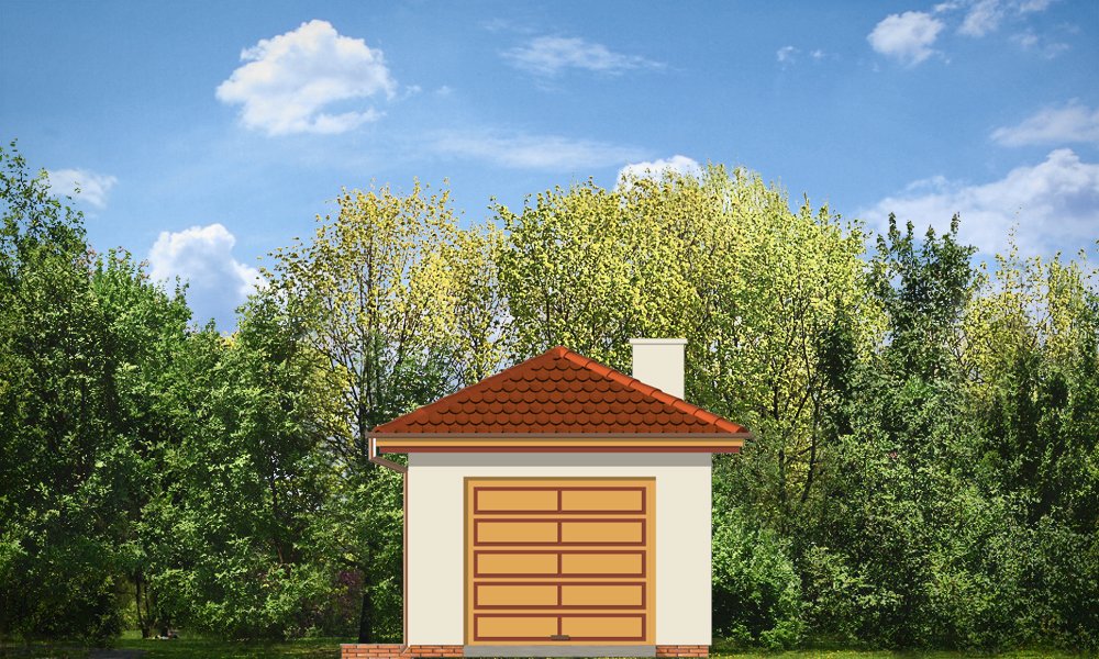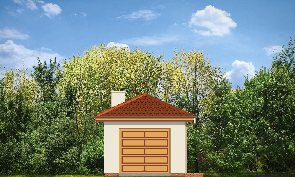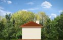Garaż jednostanowiskowy z pomieszczeniem gospodarczym z tyłu (dostępny również jako budynek gospodarczy) przykryty dachem wielospadowym z dodatkowym wyjściem od strony elewacji bocznej.