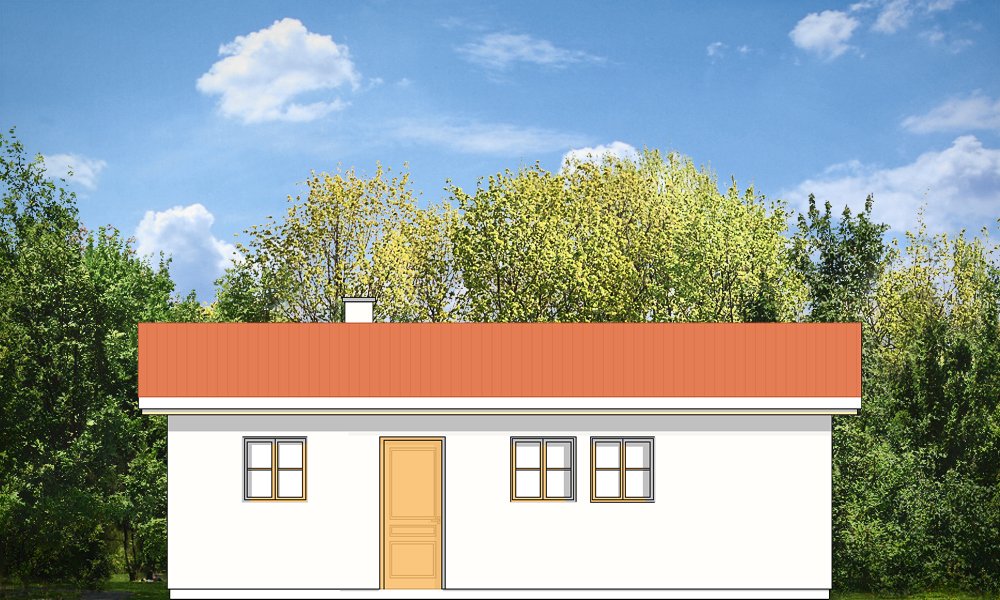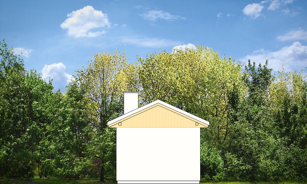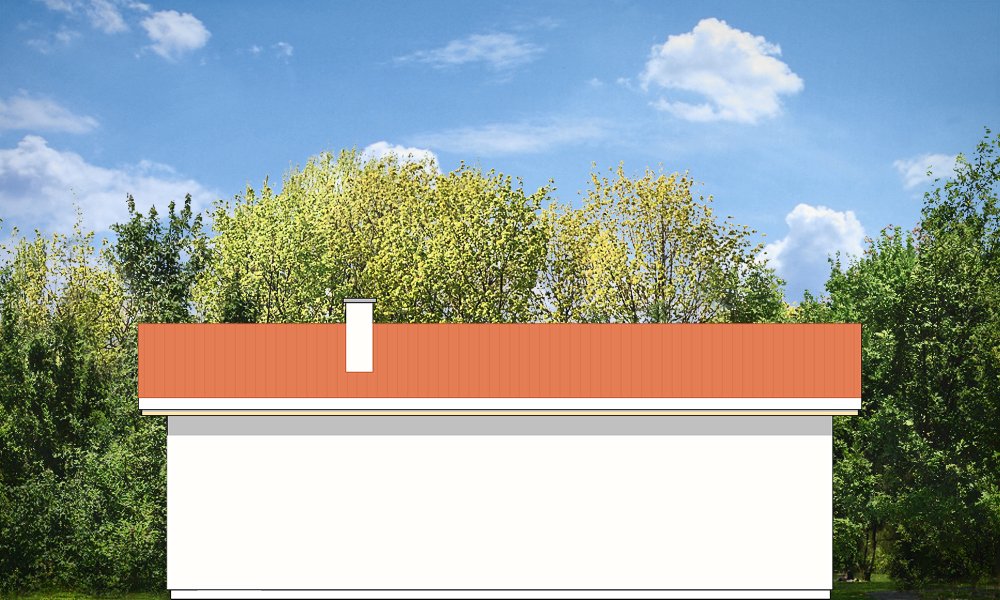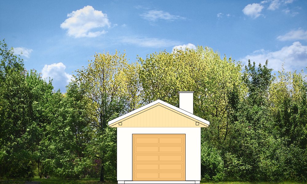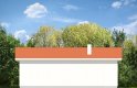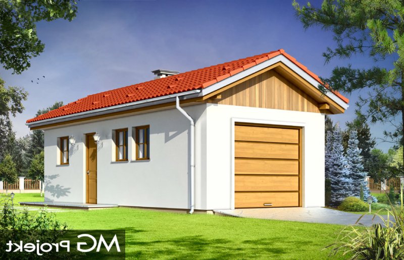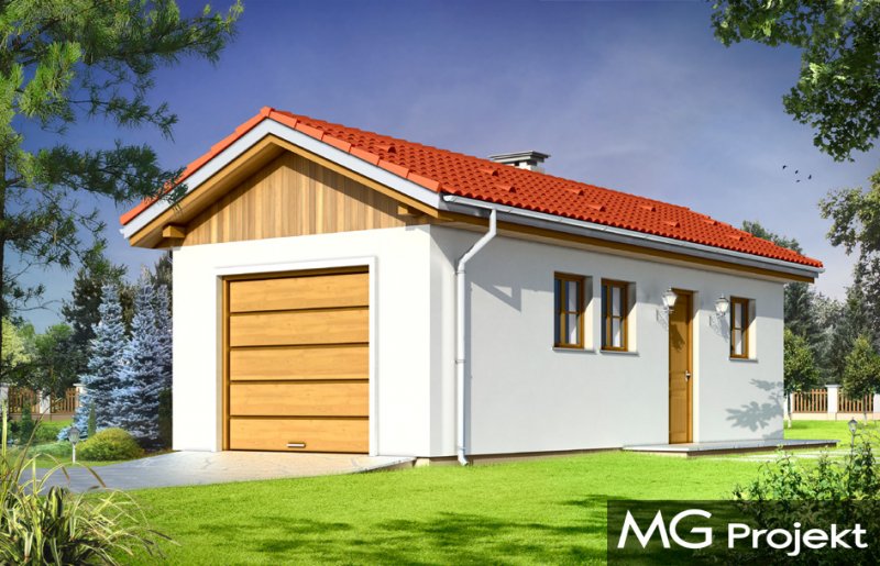 Garaż jednostanowiskowy z pomieszczeniem gospodarczym z tyłu (dostępny również jako budynek gospodarczy) przykryty dachem dwuspadowym z dodatkowym wyjściem od strony elewacji bocznej.