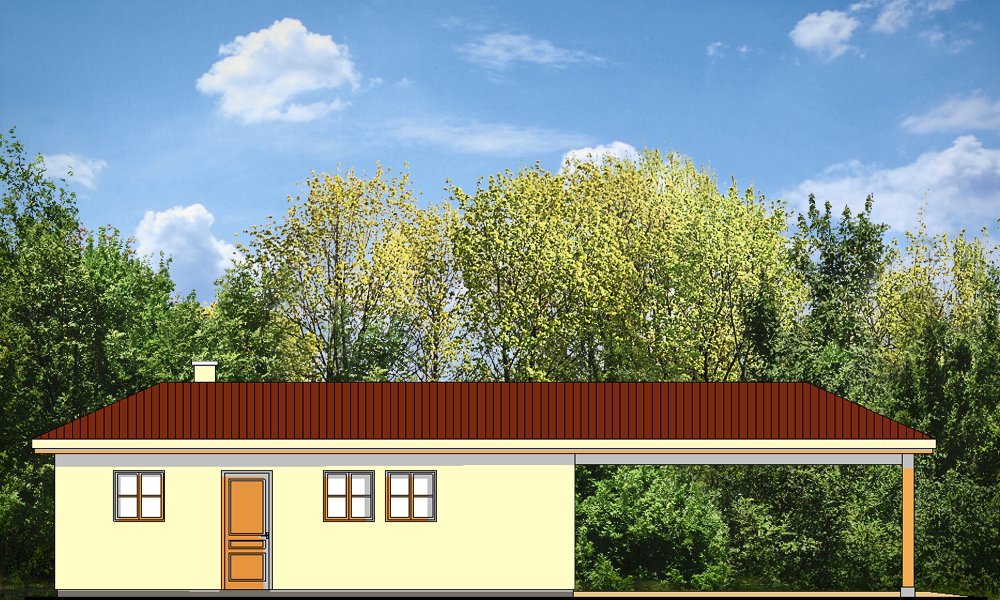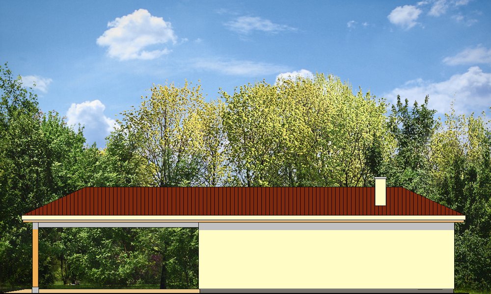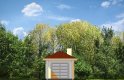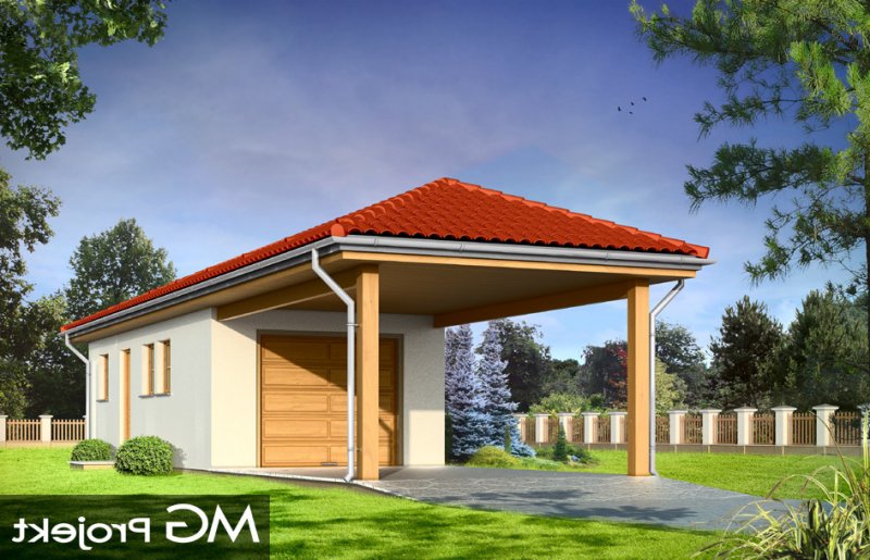 Garaż jednostanowiskowy z pomieszczeniem gospodarczym z tyłu (dostępny również jako budynek gospodarczy) przykryty dachem wielospadowym z dodatkowym wyjściem od strony elewacji bocznej oraz z wiatą od frontu pełniącą funkcję dodatkowego stanowiska parkingowego.