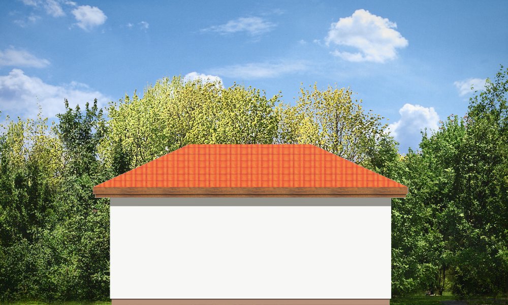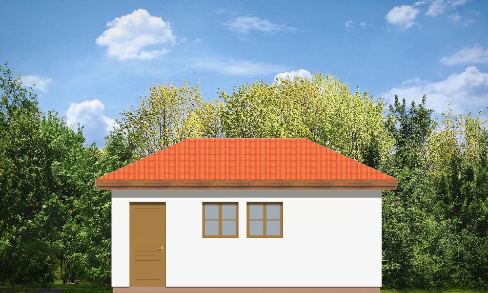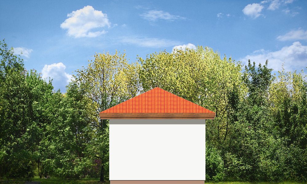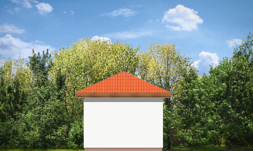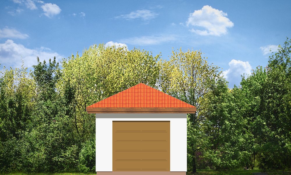 Garaż jednostanowiskowy przykryty dachem wielospadowym z dodatkowym wyjściem od strony elewacji bocznej.