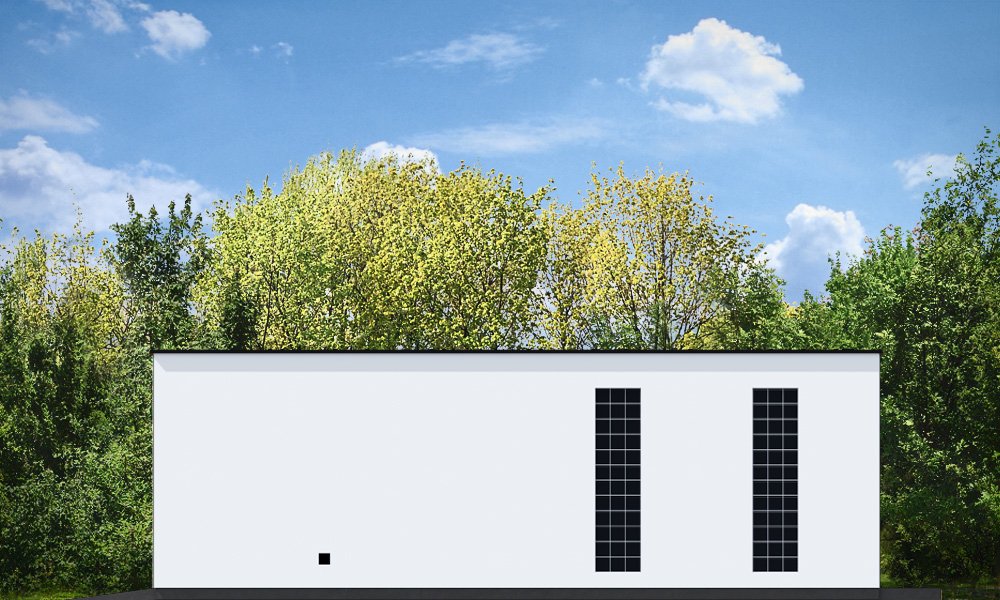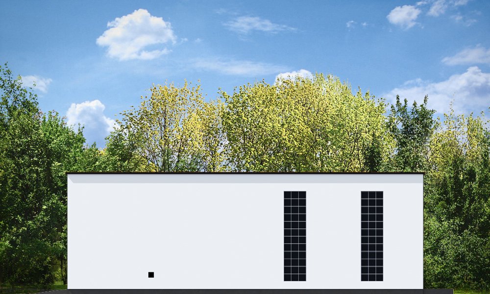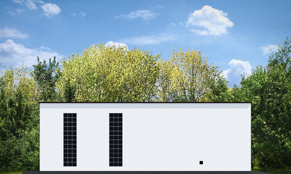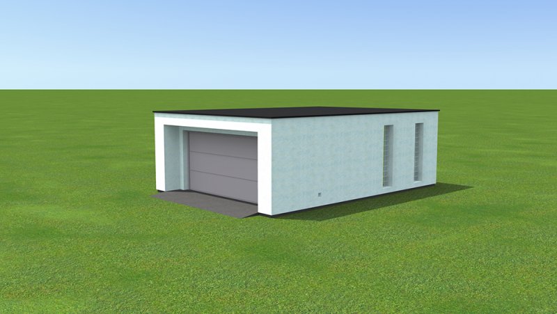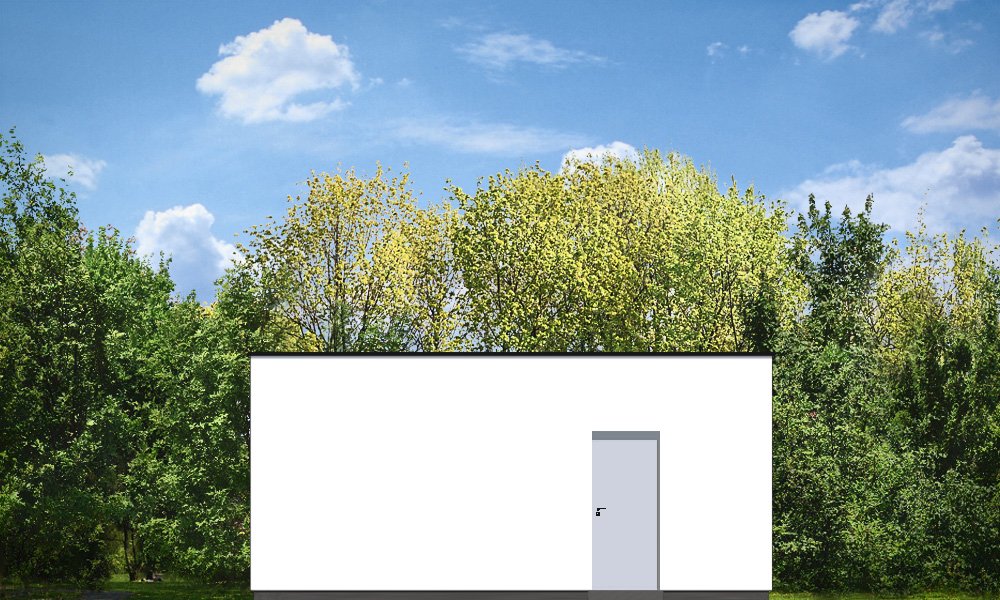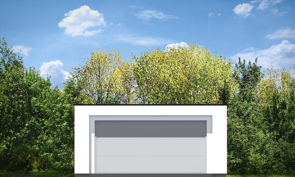 Garaż dwustanowiskowy przykryty dachem płaskim z dodatkowym pomieszczeniem gospodarczym za garażem z osobnym wyjściem od strony elewacji tylnej.