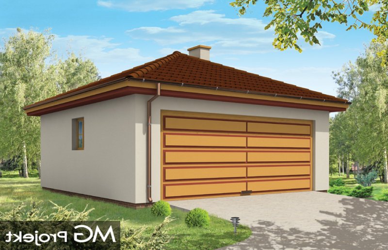 Garaż dwustanowiskowy przykryty dachem czterospadowym.
