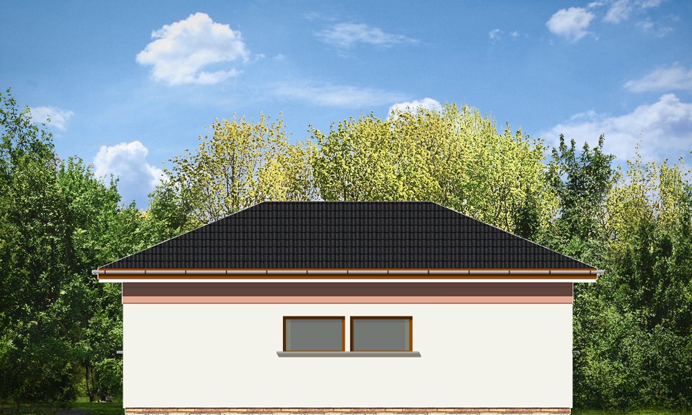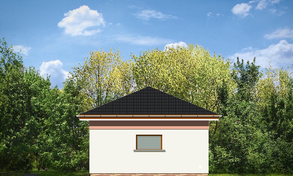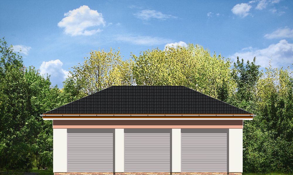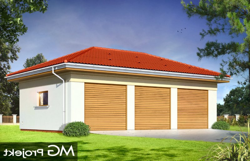 Garaż trzystanowiskowy przykryty dachem wielospadowym.