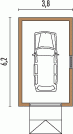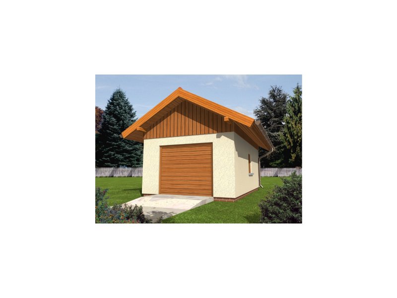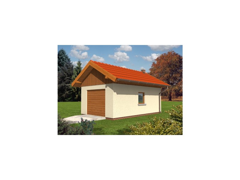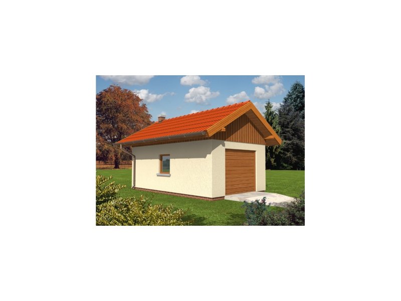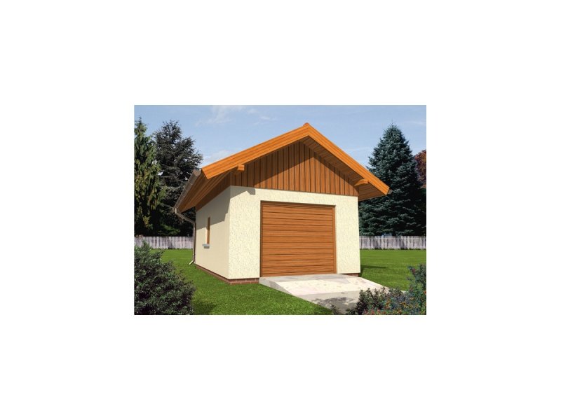 Garaż jednostanowiskowy niepodpiwniczony kryty dachem dwuspadowym. Budynek zaprojektowano w technologii murowej. Brama garażowa uchylna.
