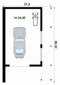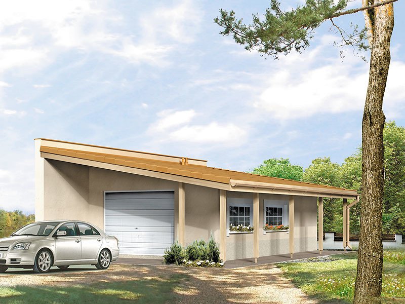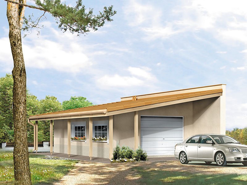 Garaż jednostanowiskowy z poszerzonym zadaszeniem z boku i od frontu budynku. Istnieje możliwość usytuowania po granicy działki.