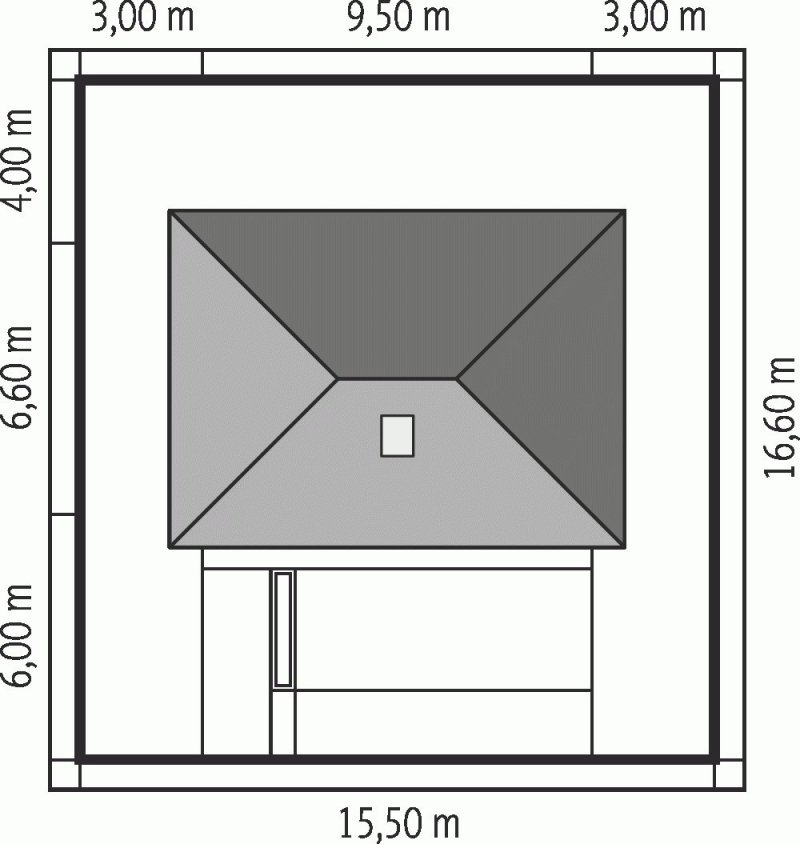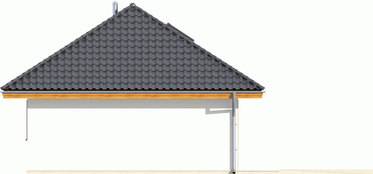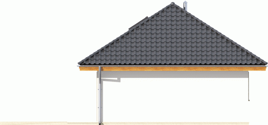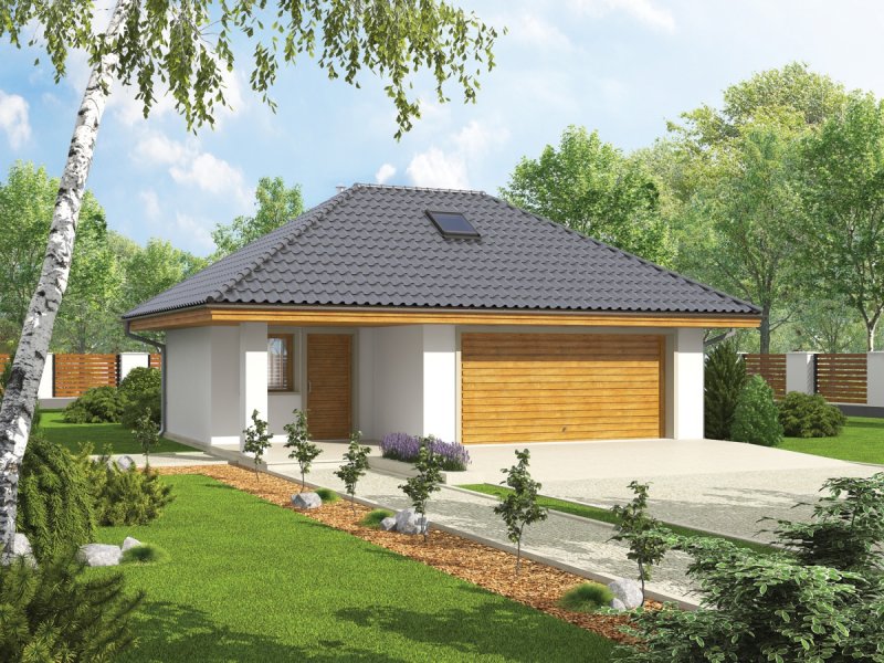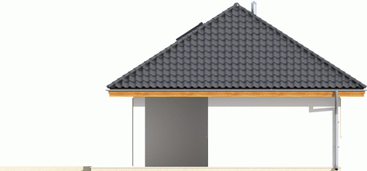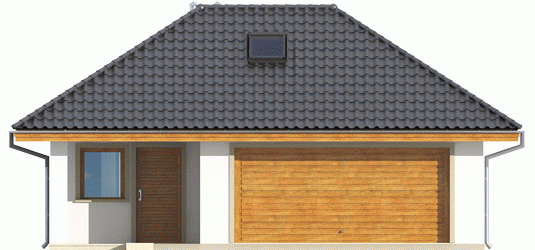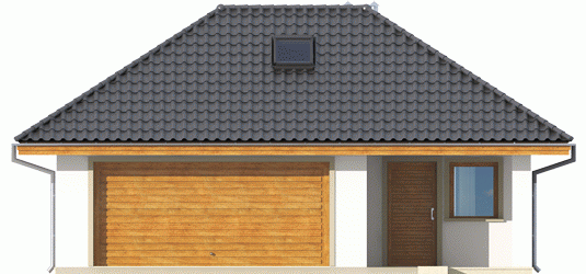 Garaż zaprojektowany w technologii murowej ze stropem drewnianym. Dach czterospadowy o konstrukcji drewnianej pokryty dachówką cementową IBF. Więźba dachowa dostępna również w systemie prefabrykacji drewnianej. Elewacje wykończono tynkiem mineralnym. Stolarka okienna drewniana lub PCV.
