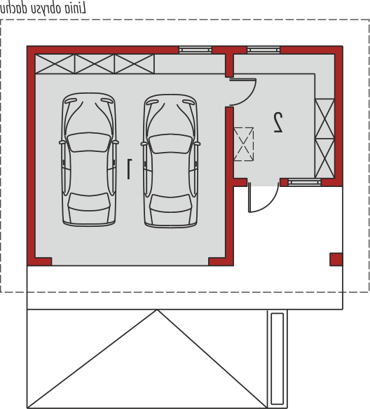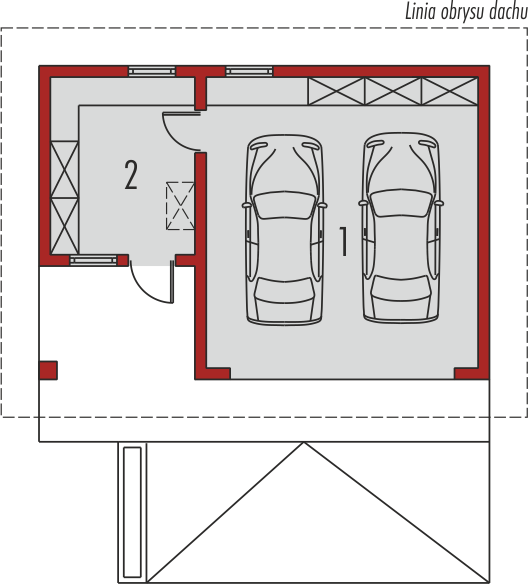 Garaż dwustanowiskowy z szeroką bramą wjazdową oraz pomieszczeniem gospodarczym, dostępnym zarówno z zewnątrz, jak i od wewnątrz budynku. Z pomieszczenia gospodarczego zaplanowano wejście poprzez składane schody na niewielki strych. Garaż G20 to doskonała propozycja dla inwestorów, którzy oprócz funkcjonalnego garażu, chcą dysponować przestrzenią, która z łatwością zmieści rowery oraz wszelkiego typu sprzęty i narzędzia. Dla wygody domowników zaplanowano komfortowe pomieszczenie gospodarcze, które można przeznaczyć również na kącik majsterkowicza (do dyspozycji pozostaje również powierzchnia strychu). Bryła i styl wykończenia garażu harmonijnie skomponują się m.in. z domem Glen.