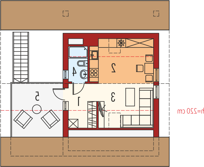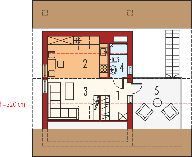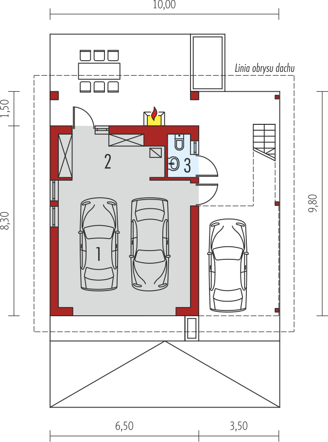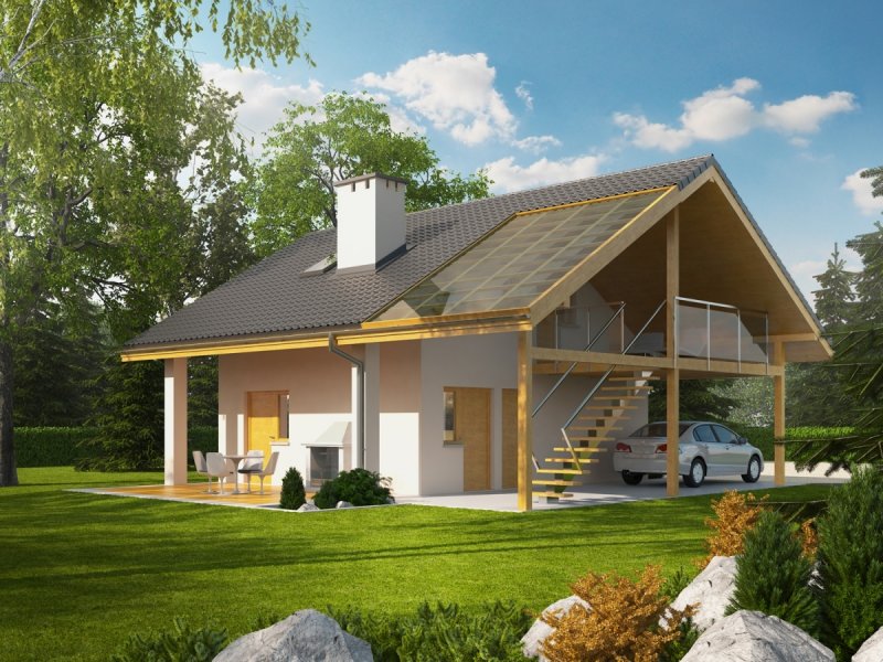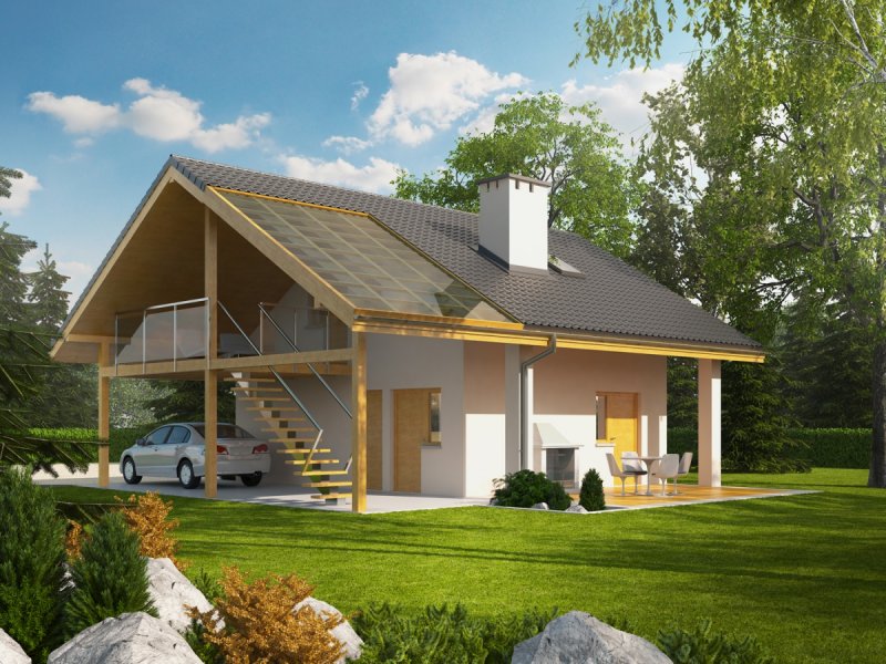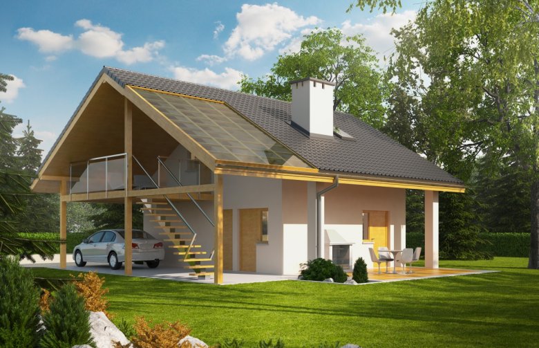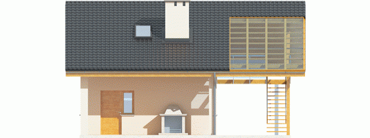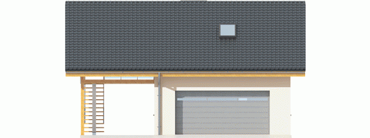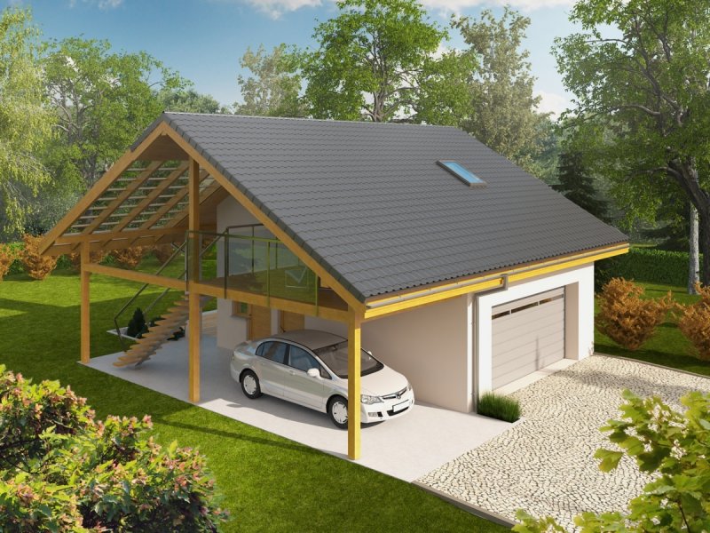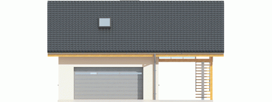 Garaż dwustanowiskowy z wiatą oraz częścią mieszkalną zlokalizowaną na poddaszu. Na parterze zaprojektowano strefę gospodarczą: garaż z przestrzenią techniczną oraz toaletą, dostępną z zewnątrz. Z boku budynku zlokalizowano wiatę na jeden samochód, natomiast w dalszej części zaplanowano strefę wypoczynkową w postaci tarasu z grillem. Na poddasze prowadzą schody zewnętrzne. Znajdują się na nim: hol z garderobą, pokój dzienny wraz z kuchnią oraz łazienka. Garaż G31 oferuje imponującą przestrzeń możliwości. Atutem budynku jest czytelny podział stref na część garażową, gospodarczą, mieszkalną oraz wypoczynkową. Poddasze z przestronnym pokojem dziennym, kuchnią oraz łazienką, w zależności od indywidualnych potrzeb, może pełnić funkcję dodatkowej części mieszkalnej, odosobnionej pracowni lub atrakcyjnej strefy rekreacyjnej. Niebagatelna architektura z ciekawymi detalami sprawia, że garaż będzie atrakcyjną ozdobą każdej działki. Bryła i styl wykończenia budynku harmonijnie skomponują się m.in. z domem Eryk, Erin, Tori, Rafael oraz Karmela.