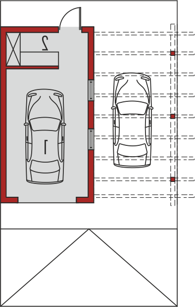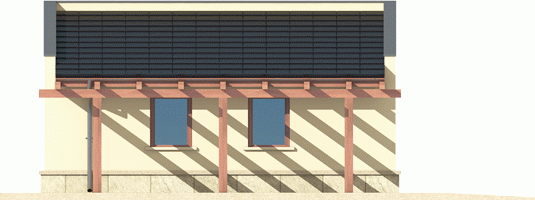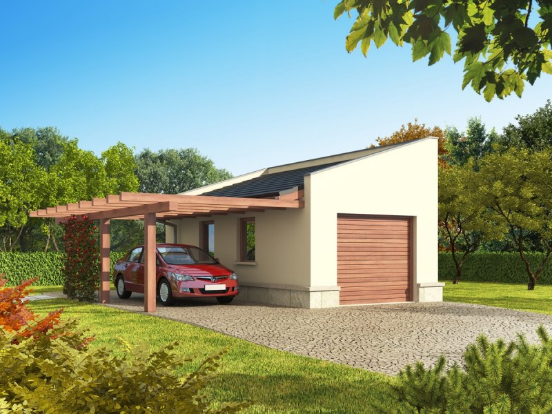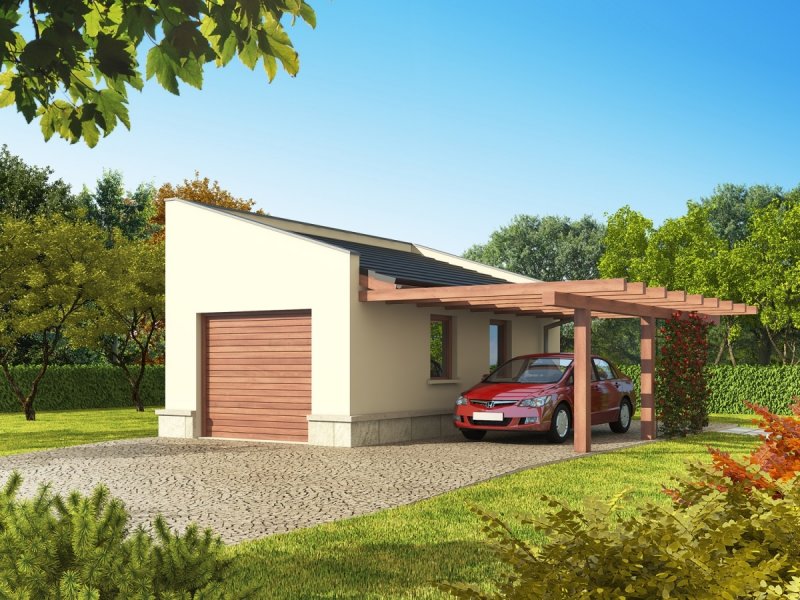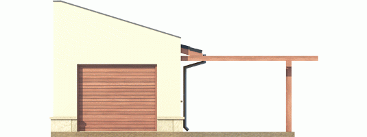Garaż jednostanowiskowy z wiatą i pomieszczeniem gospodarczym, dostępnym zarówno z zewnątrz, jak i od wewnątrz budynku. Garaż G33 wyróżnia oryginalna bryła oraz ciekawa linia dachu. Atrakcyjnym elementem budynku jest wiata, która oprócz swojej funkcji dekoracyjnej, spełnia się również jako funkcjonalne miejsce postojowe oraz komfortowa strefa rekreacyjna. Garaż G33 został dodatkowo wyposażony w praktyczne pomieszczenie gospodarcze, które w miarę potrzeb domowników można przeznaczyć na składzik na narzędzia lub mini-warsztat.