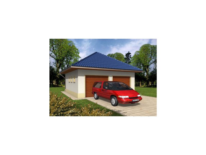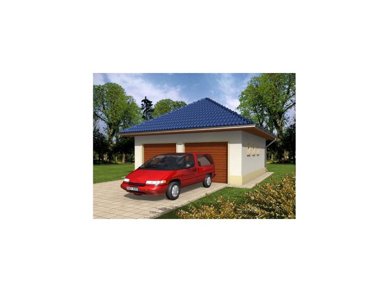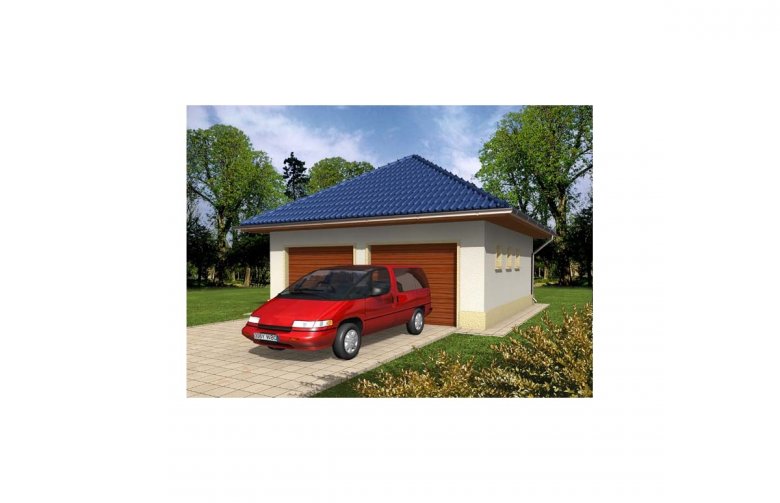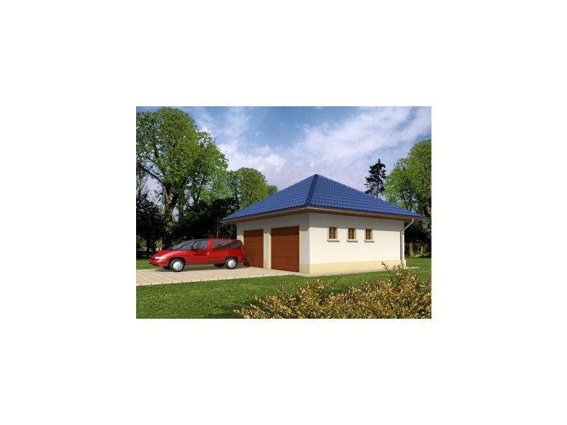 Garaż zaprojektowano w technologii murowej ze stropem drewnianym. Ściany z betonu komórkowego firmy H+H. Dach czterospadowy o konstrukcji drewnianej pokryto dachówką cementową lub ceramiczną. Elewację wykonano z tynku strukturalnego. Stolarka okienna i drzwiowa drewniana.
