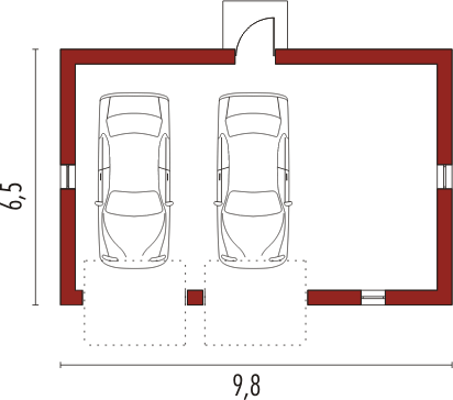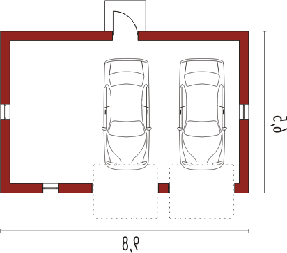 Garaż dwustanowiskowy niepodpiwniczony poszerzony o przestrzeń magazynową obok miejsc postojowych.