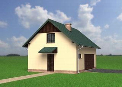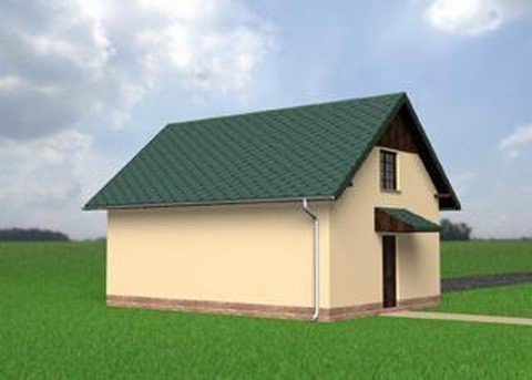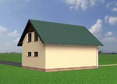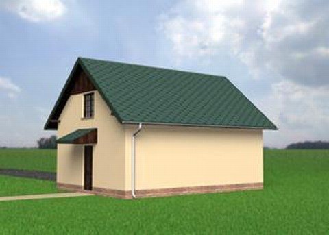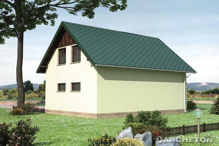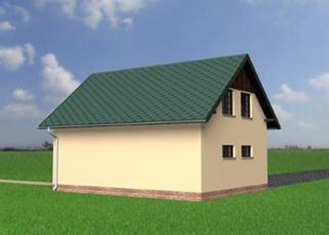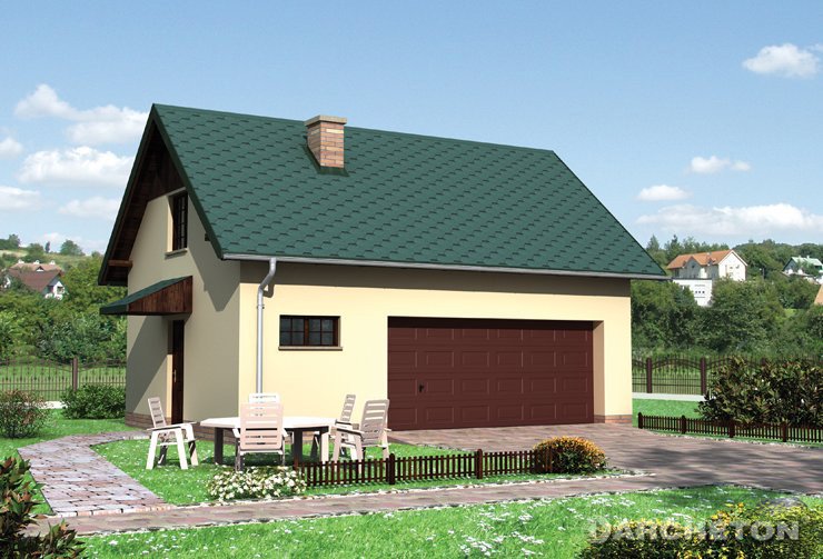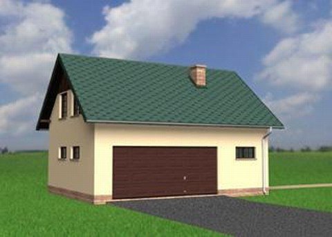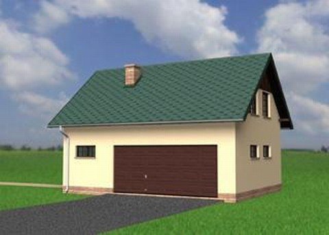 Budynek parterowy z garażem na dwa samochody oraz częścią mieszkalną na poddaszu.