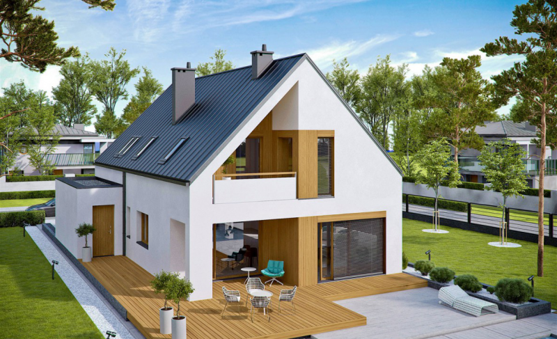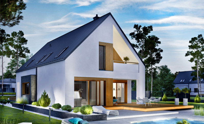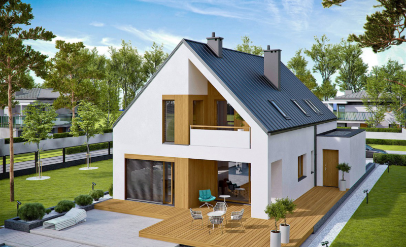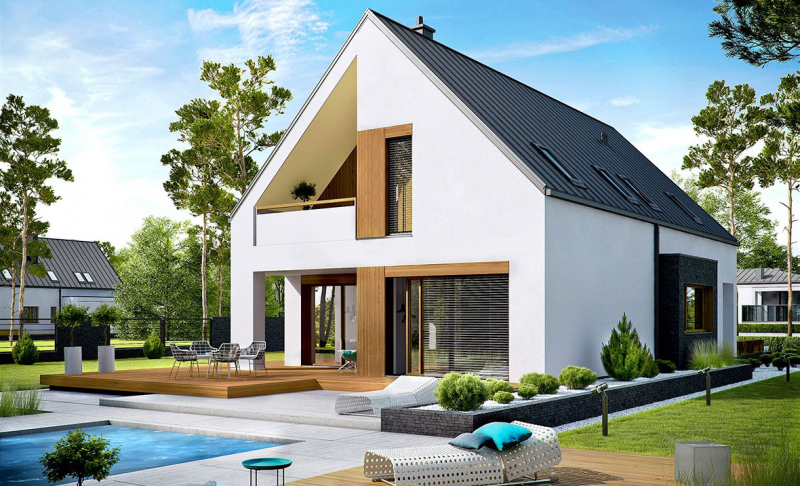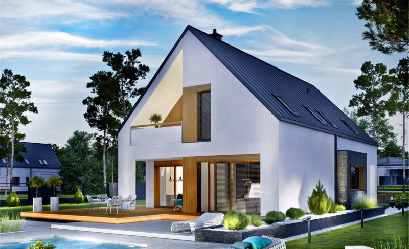 Riko III G2 to funkcjonalny i energooszczędny dom zamknięty w modnej bryle nowoczesnej stodoły, która gwarantuje bardzo dobre parametry cieplne. Dwuspadowy, elegancki dach pokryty blachą zgrabnie kontrastuje z bielą ścian, drewnianymi płaszczyznami i antracytowym detalem wykusza. Ciekawym elementem elewacji są bardzo przytulne loggie na poddaszu. Dobrze doświetlone wnętrze domu ma swoją kontynuację w częściowo osłoniętym tarasie, który pozwoli na relaks nawet w czasie niepogody. Riko III G2 to propozycja dla wymagającej komfortu w minimalistycznym wydaniu współczesnej rodziny!