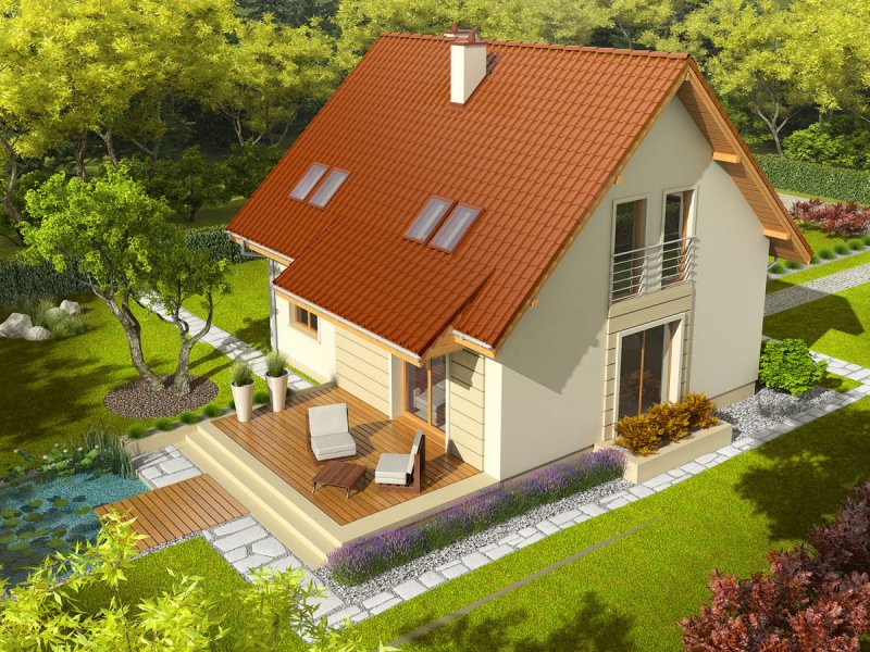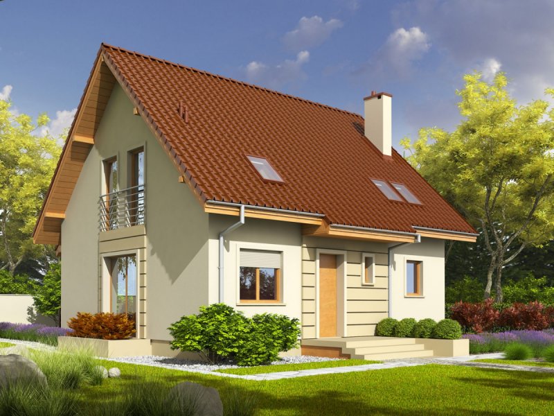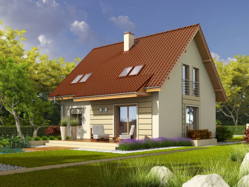 Dom zaprojektowany w technologii murowej ze stropem gęstożebrowym. Schody wewnętrzne drewniane. Dach o konstrukcji drewnianej pokryty dachówką cementową IBF. Elewacje wykończono tynkiem mineralnym w kolorze TO-PA001 z palety firmy Termo Organika i okładziną kamienną. Stolarka okienna drewniana lub PCV. Rolety zewnętrzne w systemie CleverBox firmy BeClever.