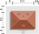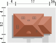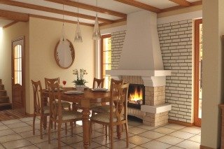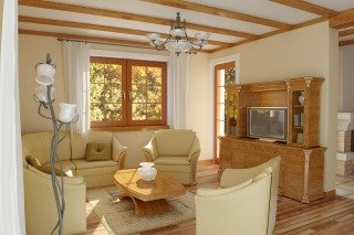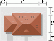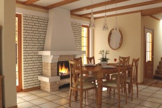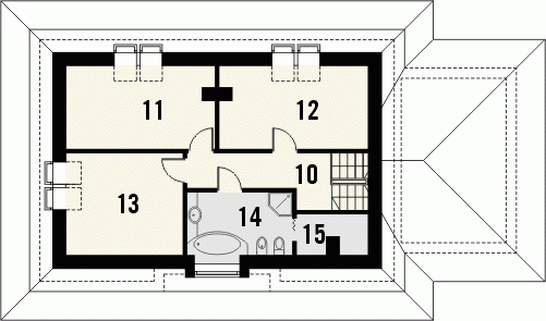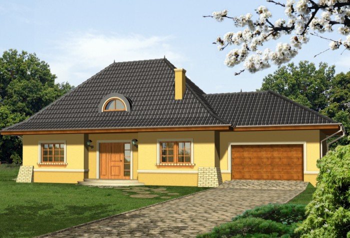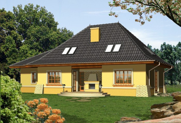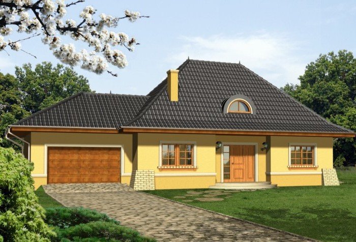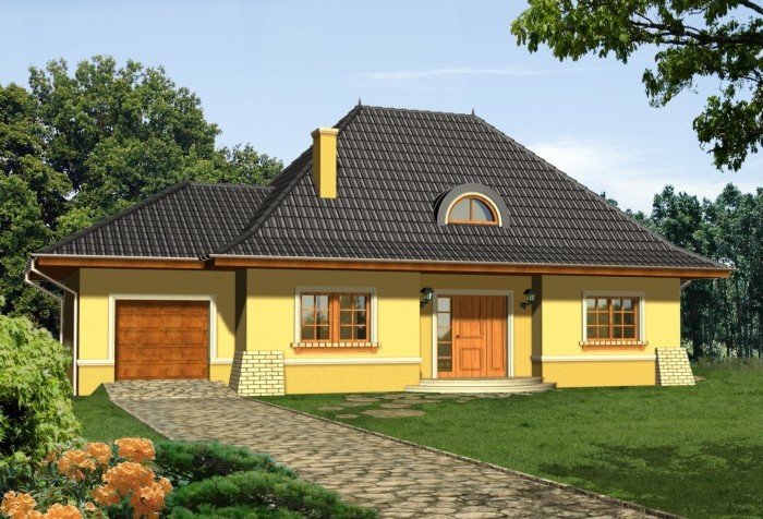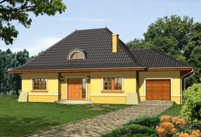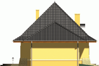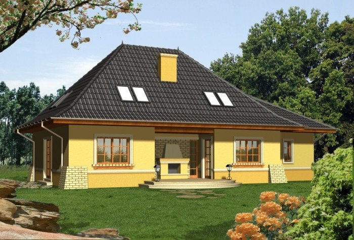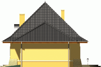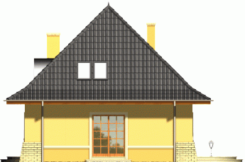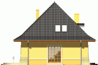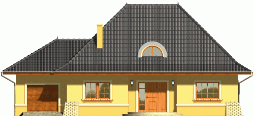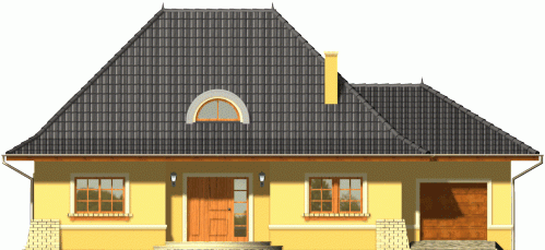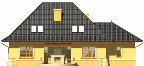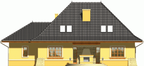 Malowniczy dom z dachem czterospadowym z garażem dostawionym z boku. Od frontu widoczne reprezentacyjne wejście na osi budynku i atrakcyjna łukowa lukarna w łazience na poddaszu. Od strony ogrodu przykuwa wzrok zadaszona wnęka z kominkiem zewnętrznym.