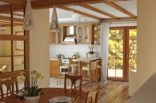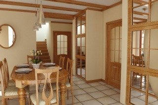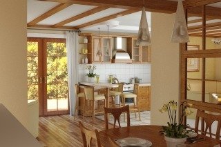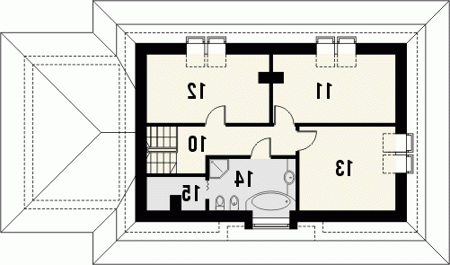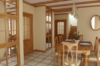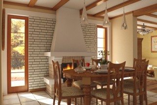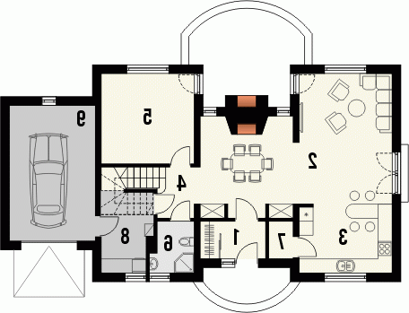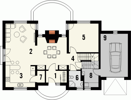 Budynek niepodpiwniczony piętrowy z garażem. Na parterze zaprojektowano pokój dzienny z otwartą kuchnią oraz reprezentacyjną jadalnię w aneksie kominkowym. Do dyspozycji jest też dodatkowy pokój, łazienka, pomieszczenie gospodarcze, spiżarka oraz garaż. Na poddaszu znajdują się trzy pokoje oraz łazienka. Dokumentacja dostępna również w odbiciu lustrzanym oraz w wersji z garażem dwustanowiskowym i bez garażu.