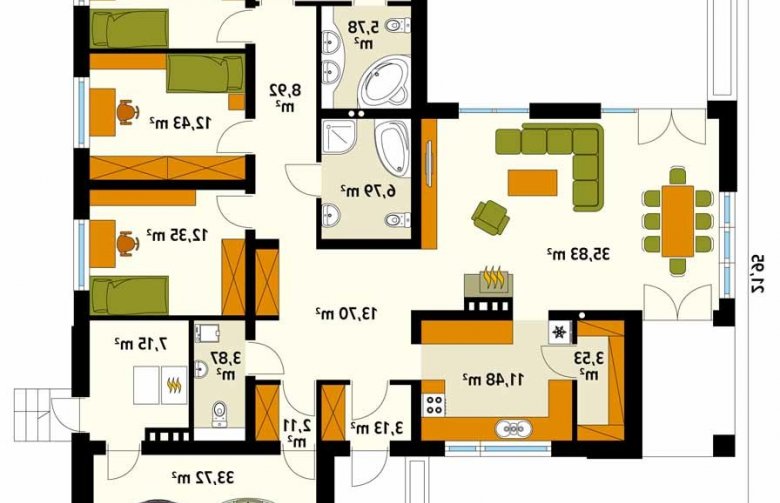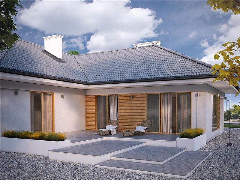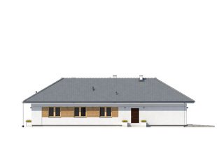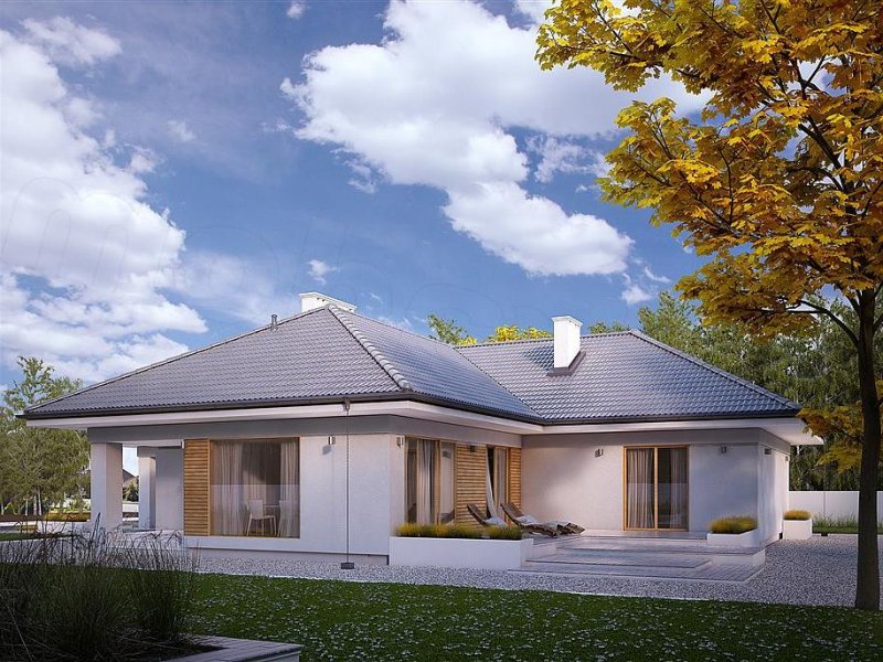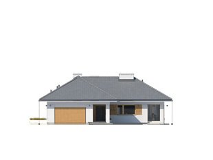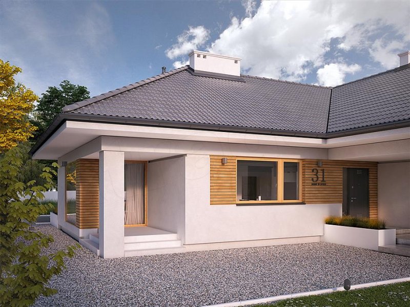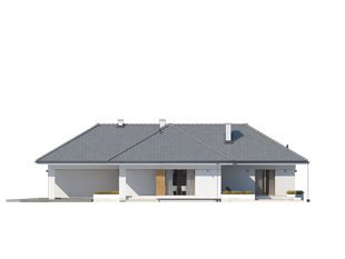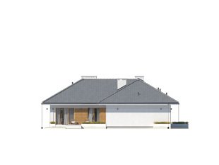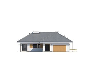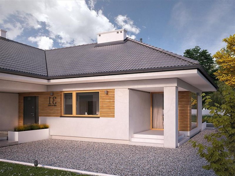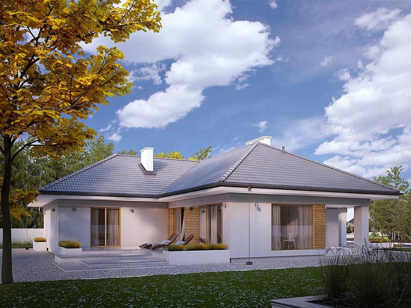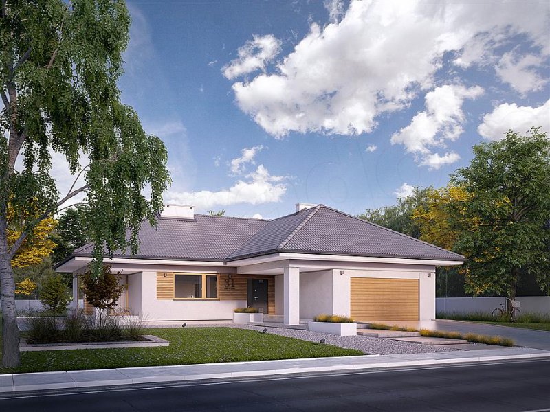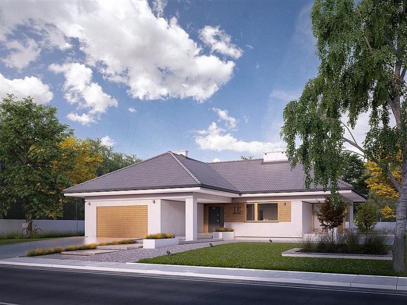 Jest to dom parterowy, o powierzchni blisko 160 metrów kw. Przeznaczony na dużą działkę. Wygodnie się tu pomieści 5-osobowa rodzina. Budynek jest niepodpiwniczony, posiada 2-stanowiskowy garaż i kotłownię na poziomie parteru. W strefie dziennej domu znajduje się przestronny salon łączony z jadalnią, skąd jest wyjście na zadaszony taras. Mieści się tu także kuchnia ze spiżarnią. Część nocna to 4 sypialnie, z których jedna ma własną łazienkę i garderobę. Jest tu też łazienka ogólnie dostępna. Dom prezentuje się okazale i efektownie. Masywnej bryle nadają lekkości duże przeszklenia oraz spadzisty dach. Zamysłem projektanta było połączenie tradycji z nowoczesnością. Dom dobrze się prezentuje w otoczeniu zadbanego ogrodu.