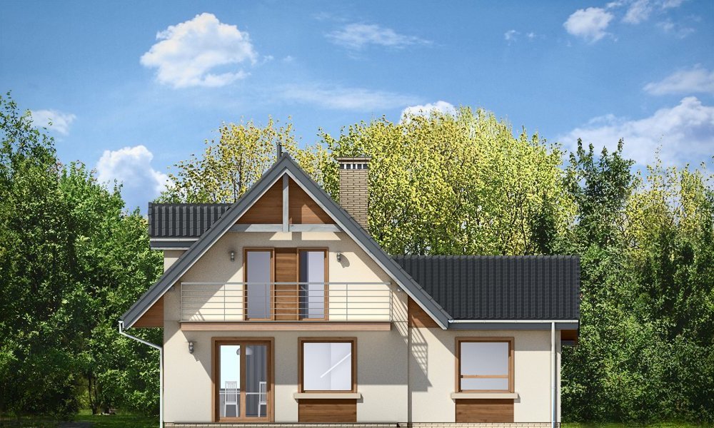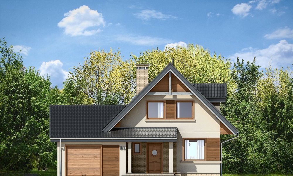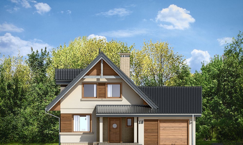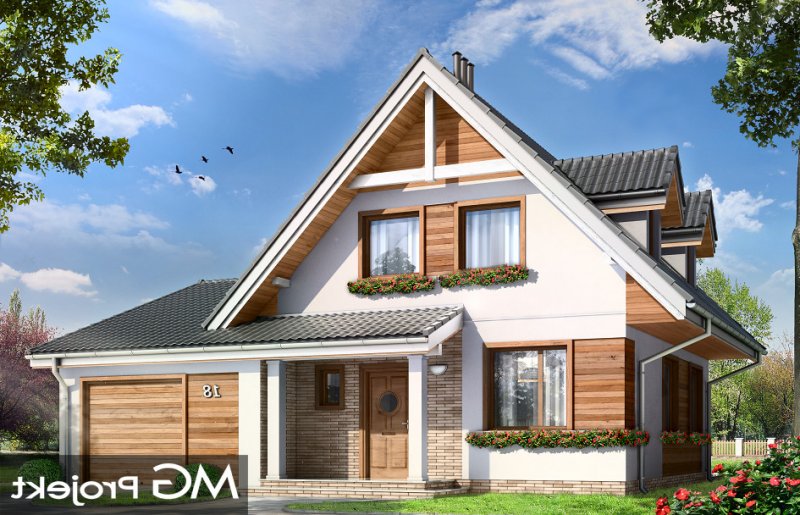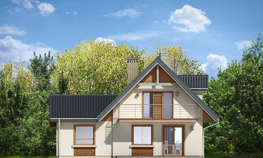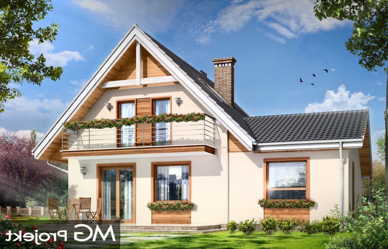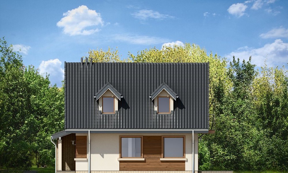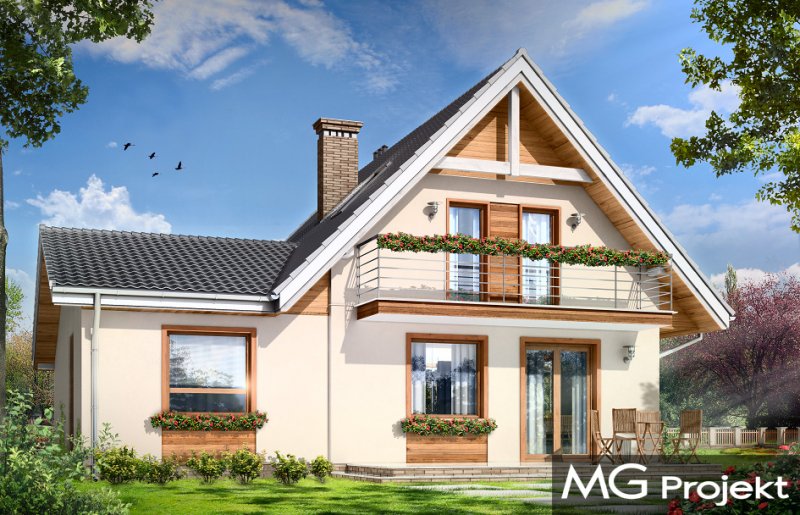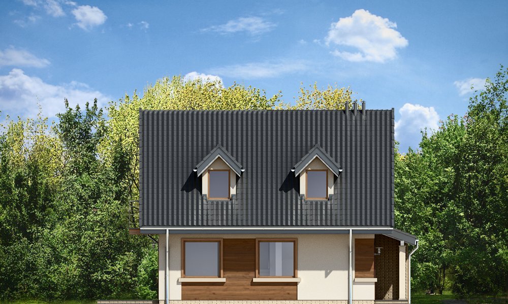 Amelia to nieduży dom parterowy z poddaszem użytkowym dla cztero-pięcioosobowej rodziny. Budynek przekryty został dwuspadowymi dachami, w projekcie przewidziano również garaż. Prostą, bezpretensjonalną bryłę domu zestawiono z nowoczesnym, oszczędnym detalem, co dodaje domowi elegancji. Dodatkową ozdobą domu są fragmenty elewacji wykończone drewnianą okładziną oraz płytkami klinkierowymi. Na parterze, oprócz jednoprzestrzennej części dziennej, z salonem, holem, otwartą kuchnią i centralnie usytuowanymi schodami, zaprojektowano dodatkowy pokój (np. sypialnię lub pokój do pracy), garaż, oraz łazienkę z miejscem na kocioł c.o. Na poddaszu zaplanowano trzy sypialnie z łazienką. Dom mimo niewielkiej powierzchni mieści w sobie wiele funkcji - w niewielu projektach domów tej wielkości znaleźć można cztery pokoje oraz salon, dwie łazienki i przestronny garaż. Pracownia posiada odbicie lustrzane projektu.
