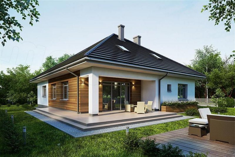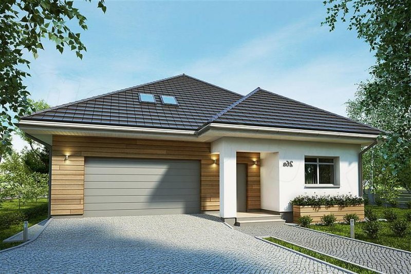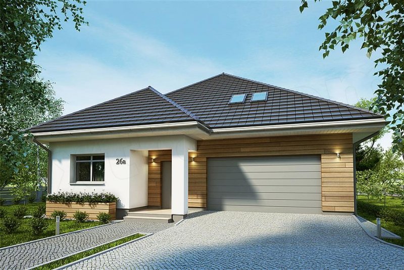 Projekt domu Ami II to ciekawa propozycja dla osób posiadających średniej szerokości działkę. Dom posiada typową bryłę, więc będzie się dobrze prezentował niezależnie od otoczenia. Projekt należy do kategorii domów z kalenicą skierowaną prostopadle do drogi, co często określane jest w warunkach zabudowy. Dom został stworzony do zabudowy wolnostojącej. W projekcie zaproponowano garaż dwustanowiskowy w bryle budynku. Bryła budynku przykryta jest dachem kopertowym, który charakteryzuje się dużą odpornością na działanie niesprzyjających warunków pogodowych. Projekt Ami II to dom parterowy z poddaszem użytkowym, dzięki czemu mamy możliwość zagospodarowania większej powierzchni. Sercem domu jest przestronna strefa dzienna, która sprzyja spędzaniu wspólnego czasu w gronie najbliższych. Otwarta kuchnia to idealne miejsce spotkań rodzinnych i ze znajomymi. W części dziennej uwzględniono salon oraz jadalnię, dzięki czemu wnętrze domu jest bardzo funkcjonalne. Ciekawym elementem jest z pewnością usytuowany w salonie kominek, który nada wnętrzu niepowtarzalny klimat. Na parterze przewidziano toaletę, natomiast poddasze wyposażone jest w pełni funkcjonalną łazienkę. W domu znajdują się trzy wygodne sypialnie, co sprawia iż jest on doskonałym wyborem dla 4-6 osobowej rodziny. Przestrzeń można wykorzystać także jako pokój dla gości lub gabinet. Lepszą organizację przestrzeni zapewnia przewidziana w domu garderoba. Taras przy domu sprzyja spędzaniu czasu na świeżym powietrzu. Budynek został zaprojektowany w technologii murowanej. W jego bryle widoczne są rozwiązania nawiązujące do stylu tradycyjnego, co jest idealnym rozwiązaniem dla osób ceniących klasykę i prostotę.