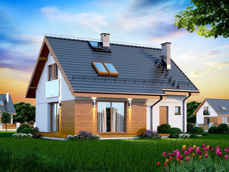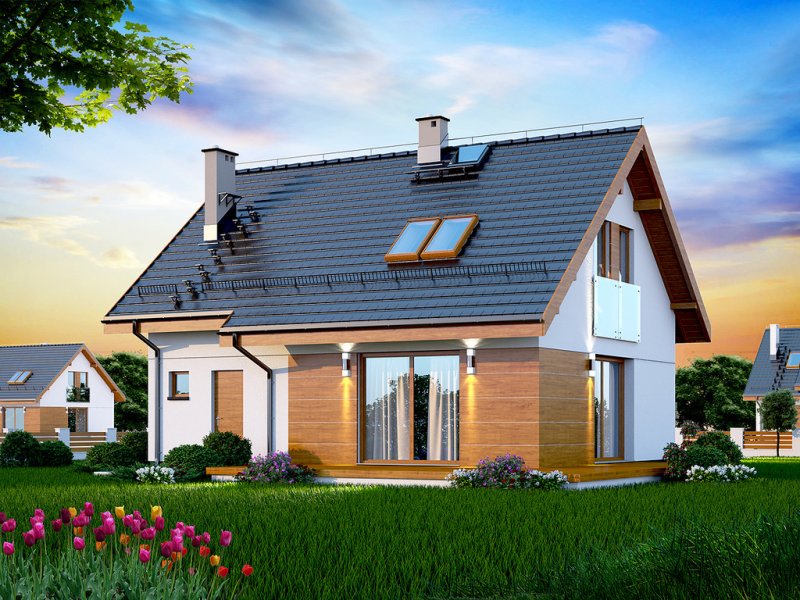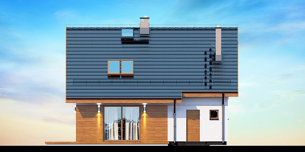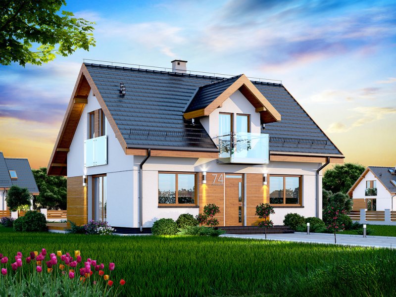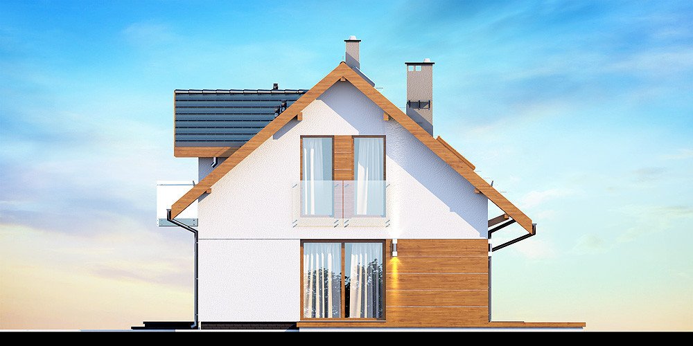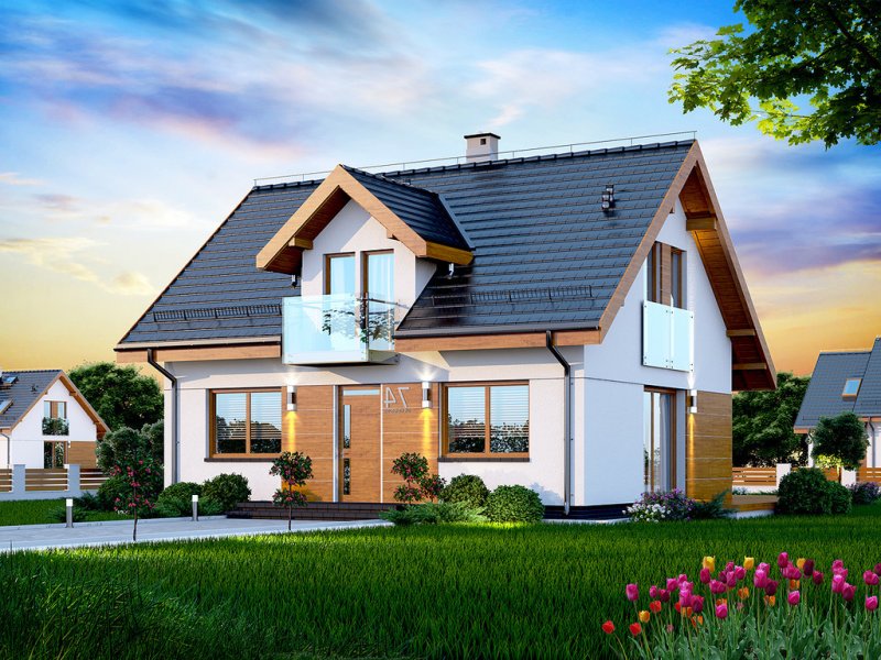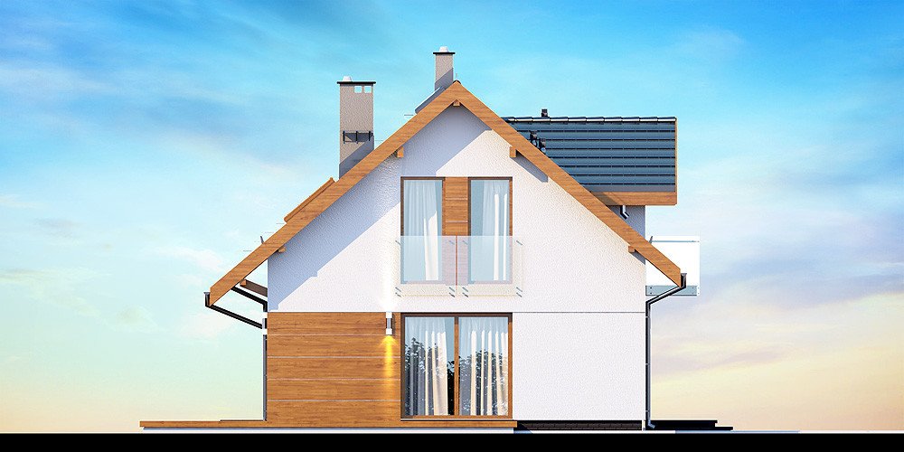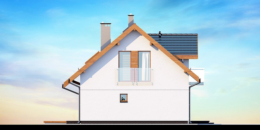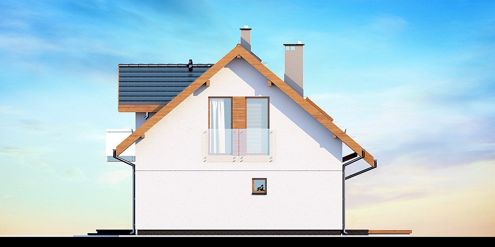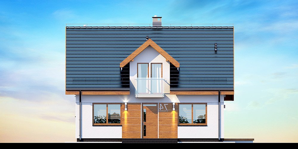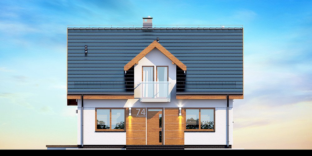 Przedstawiamy Państwu projekt Armanda XS. To propozycja, której warto poświęcić chwilę uwagi i bliżej przyjrzeć się rozwiązaniom, które proponuje. Jest skierowana do rodzin, które planują budowę niedużego i niedrogiego domu z poddaszem użytkowym. Budynek został zaprojektowany jako energooszczędny. Utrzymaniu rachunków za ogrzewanie na niewygórowanym poziomie sprzyja zwarty i prosty kształt bryły budynku. Zaplanowano ją na rzucie w kształcie prostokąta i przekryto stromym dachem dwuspadowym. Frontową połać dachu ozdabia elegancka lukarna z przeszklonym balkonem. Architektura budynku stanowi subtelne połączenie tradycji z nowoczesnością oraz dbałością o zachowanie odpowiednich proporcji.