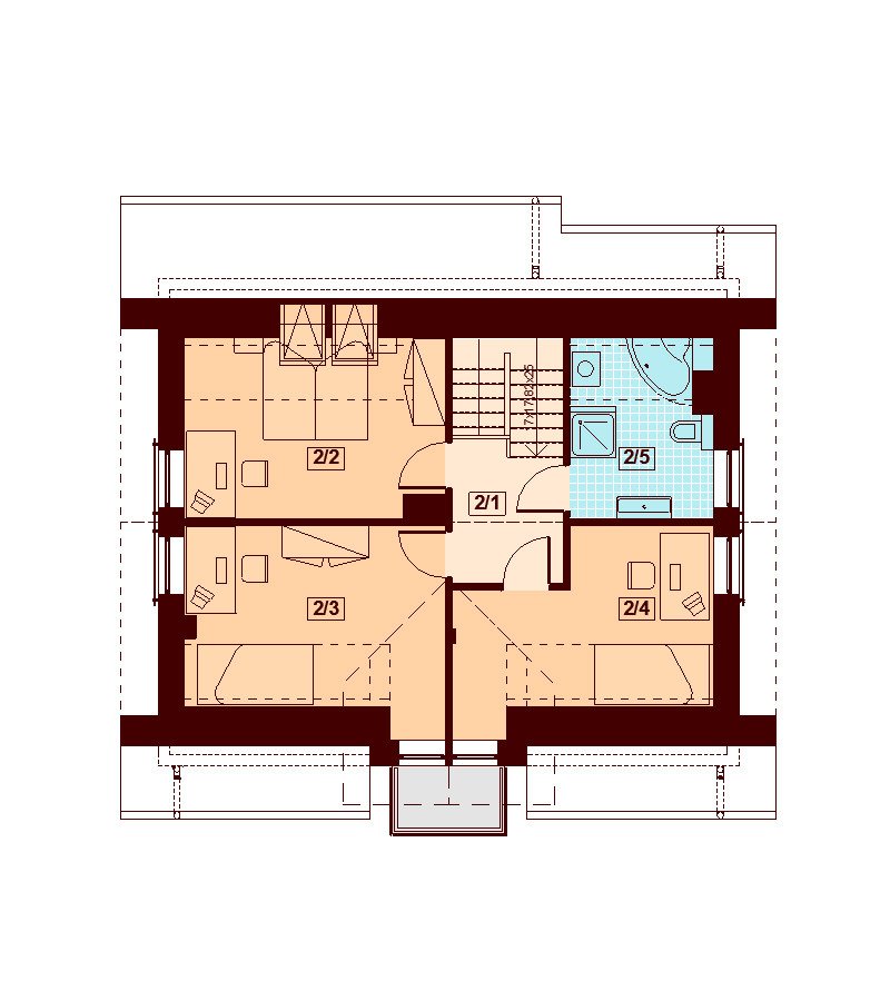 Pomiędzy kondygnacjami domu Armanda XS zaplanowano strop gęstożebrowy. U góry znajdują się trzy przytulne sypialnie. Dwie z nich mają dostęp do wspólnego balkonu. Na poddaszu ponadto zaprojektowano wygodną łazienkę.