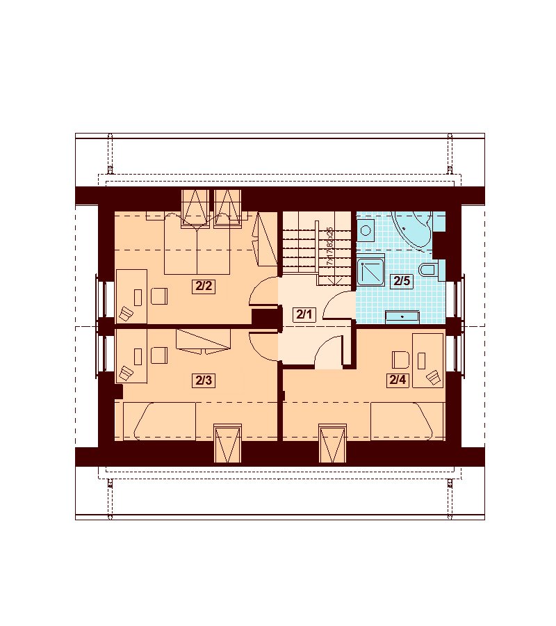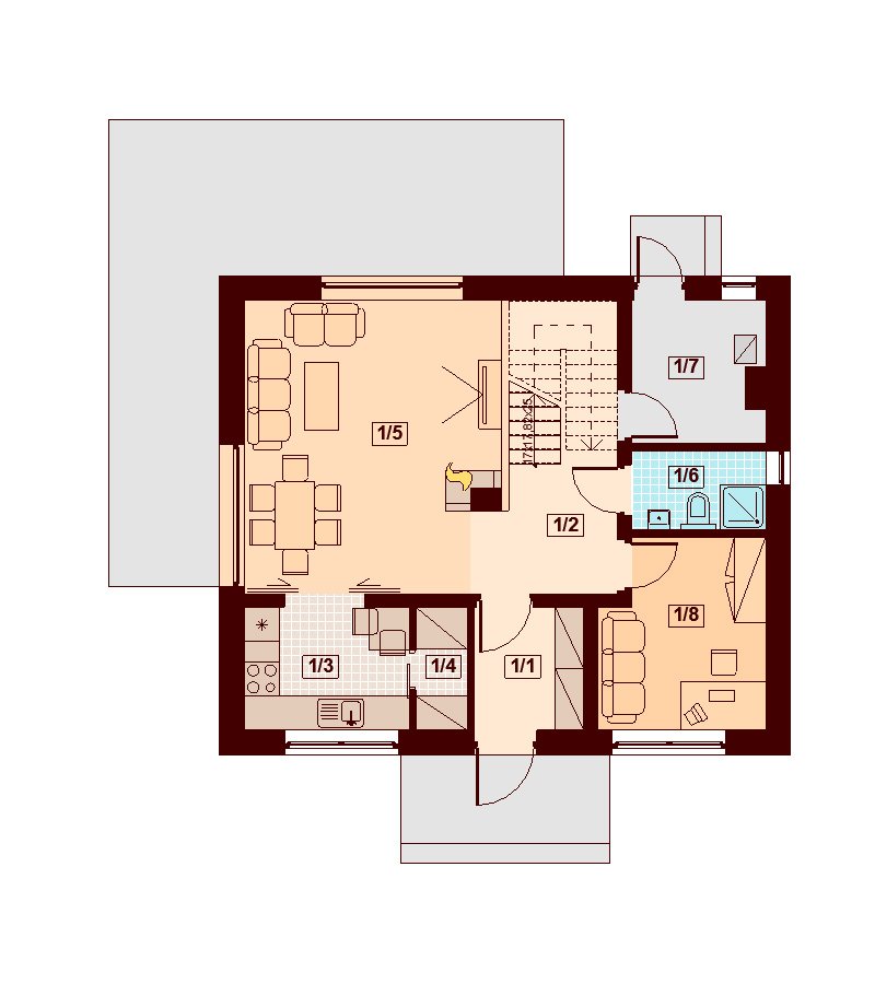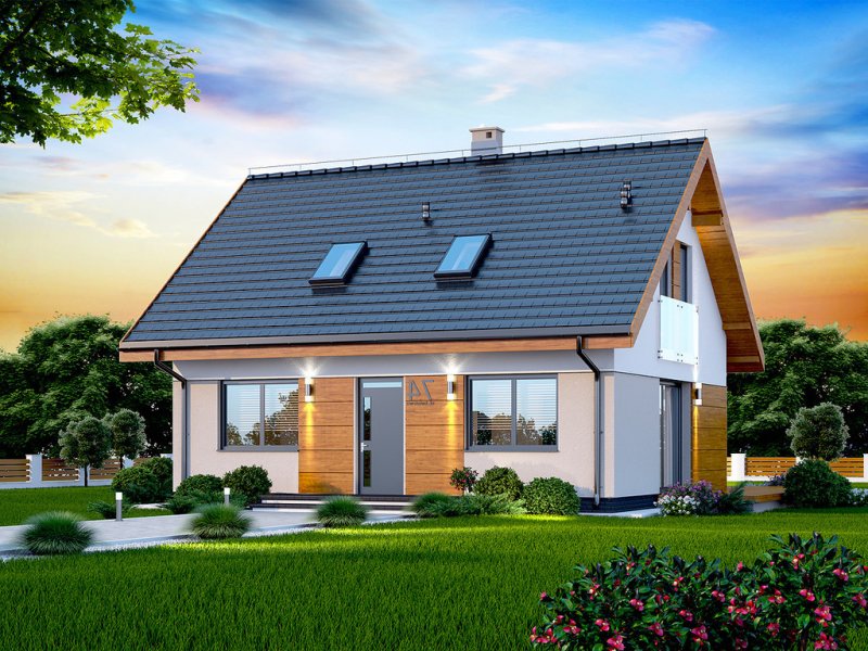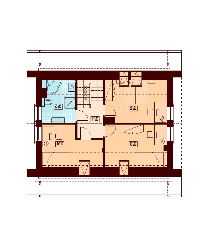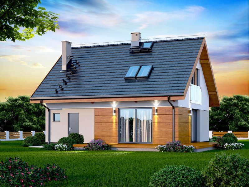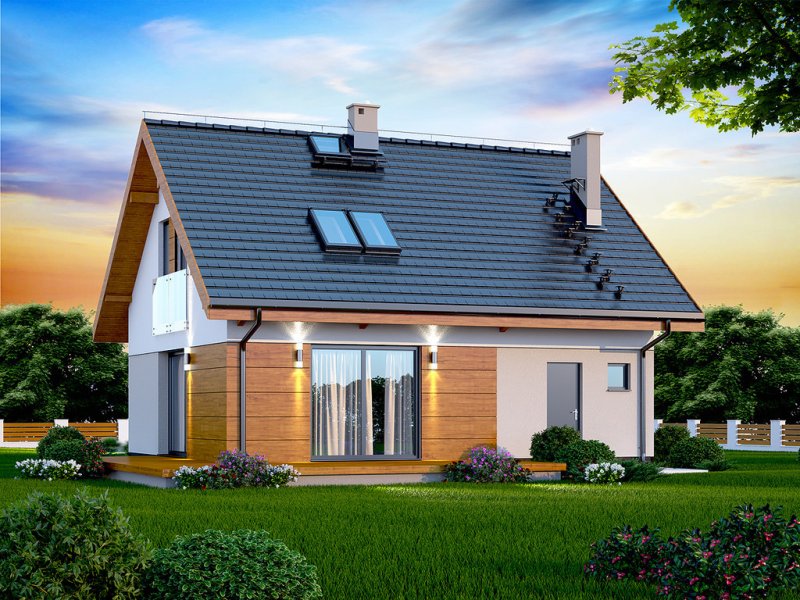 Armanda XS BIS to funkcjonalny, niewielki, piękny dom o prostej i taniej, dokładnie przemyślanej konstrukcji, przeznaczony dla 3-6 osobowej rodziny, o eleganckiej formie i współczesnej, subtelnej estetyce. Jest to budynek parterowy z użytkowym poddaszem, niepodpiwniczony. Na parterze zlokalizowana jest obszerna strefa dzienna składająca się z kuchni (która w zależności od potrzeb może być zamykana lub otwarta) jadalni oraz salonu otwartego na taras i ogród. Uzupełnieniem kuchni jest pojemna spiżarnia. Schody w holu w zależności od potrzeb mogą być otwarte na salon powiększając w ten sposób przestrzeń dzienną i stanowiąc ciekawy element architektoniczny, mogą też być odizolowane ścianką działową od salonu. Dzięki doświetleniu strefy dziennej zarówno od strony ogrodu jak i z boku dom nadaje się na każdą działkę, zarówno z wjazdem od północy jak i od południa, wschodu bądź zachodu. Dodatkowo na parterze zaprojektowano pokój który może służyć jako pokój gościnny bądź gabinet, łazienkę oraz pomieszczenie gospodarcze. W wiatrołapie przewidziano miejsce na dużą szafę wnękową. Na poddaszu zaprojektowano trzy pokoje oraz wygodną łazienkę. W projektowaniu domu szczególną uwagę zwrócono na atrakcyjny wygląd zewnętrzny, proporcjonalność bryły budynku, odpowiednie doświetlenie i funkcjonalne rozplanowanie pomieszczeń przy zachowaniu prostoty konstrukcji oraz zwartości bryły domu. Architektura domu to połączenie tradycji z nowoczesnością oraz elegancji z dbałością o proporcje, estetykę i funkcjonalność. Dom zaprojektowano jako energooszczędny. Dostępna również wersja projektu z lukarną od strony elewacji frontowej (projekt Armanda XS) oraz większe wersje domu, projekty: Armanda Mała BIS, Armanda Mała, Armanda, Armanda BIS, Belinda.