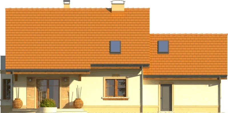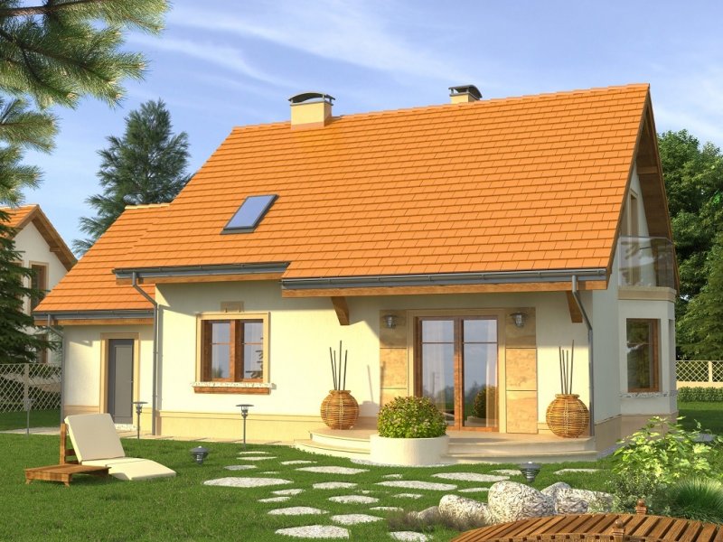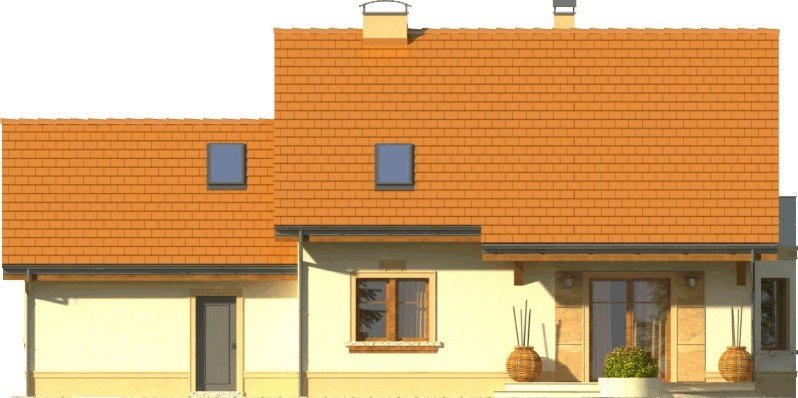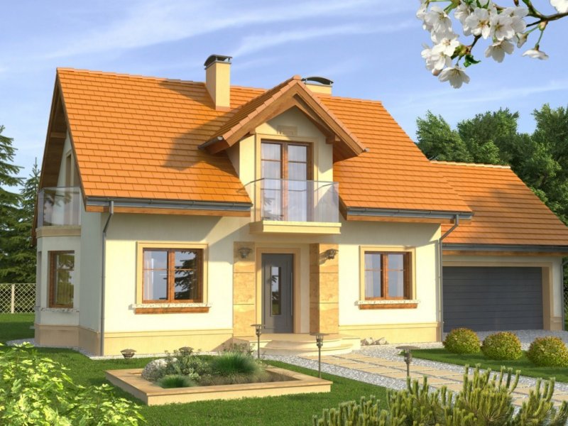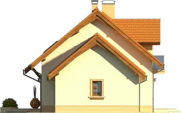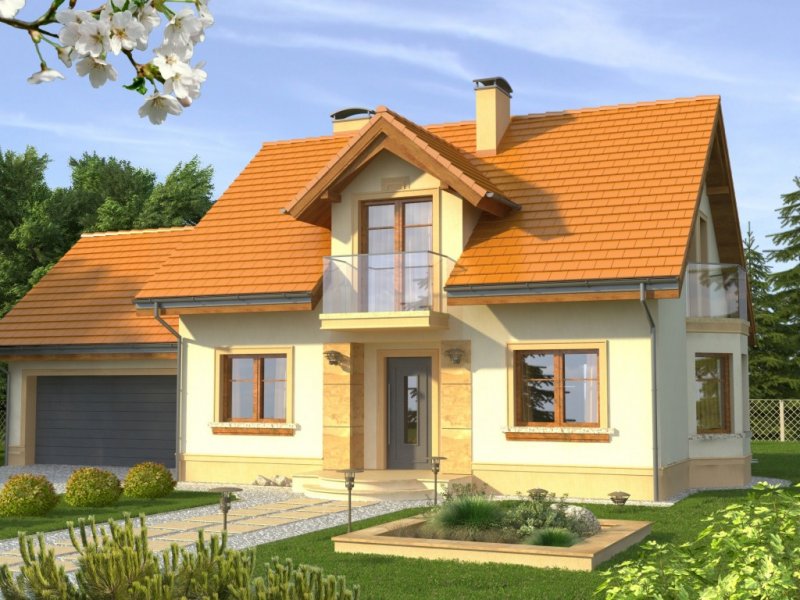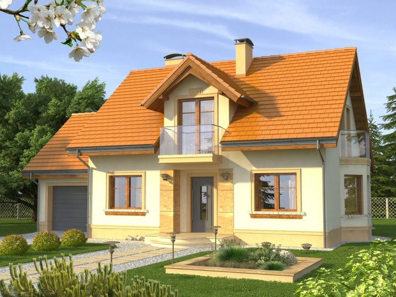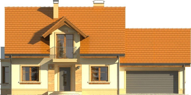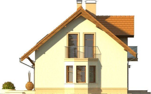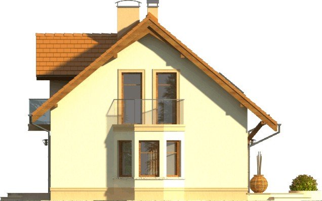 Atrakcyjny dom przykryty dachem dwuspadowym. Wejście podkreślono lukarną oraz balkonem. Ciekawym elementem jest wykusz jadalni.