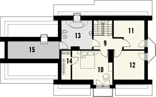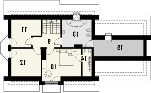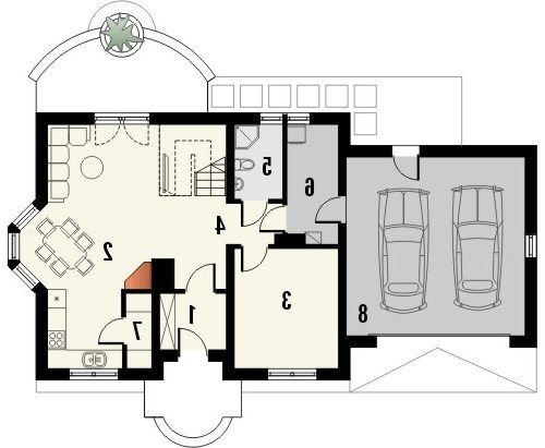 Budynek piętrowy z garażem dwustanowiskowym. Na parterze salon z otwartą kuchnią, dodatkowy pokój, łazienka i pomieszczenie gospodarcze. Na poddaszu zaprojektowano łazienkę i 3 sypialnie, z czego jedna z nich ma garderobę. Dokumentacja dostępna również w odbiciu lustrzanym.