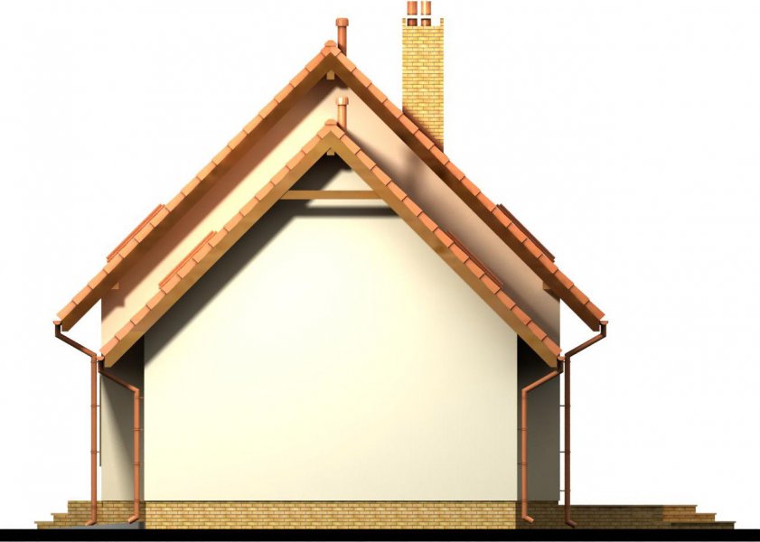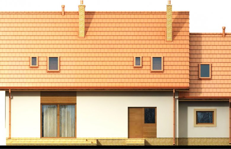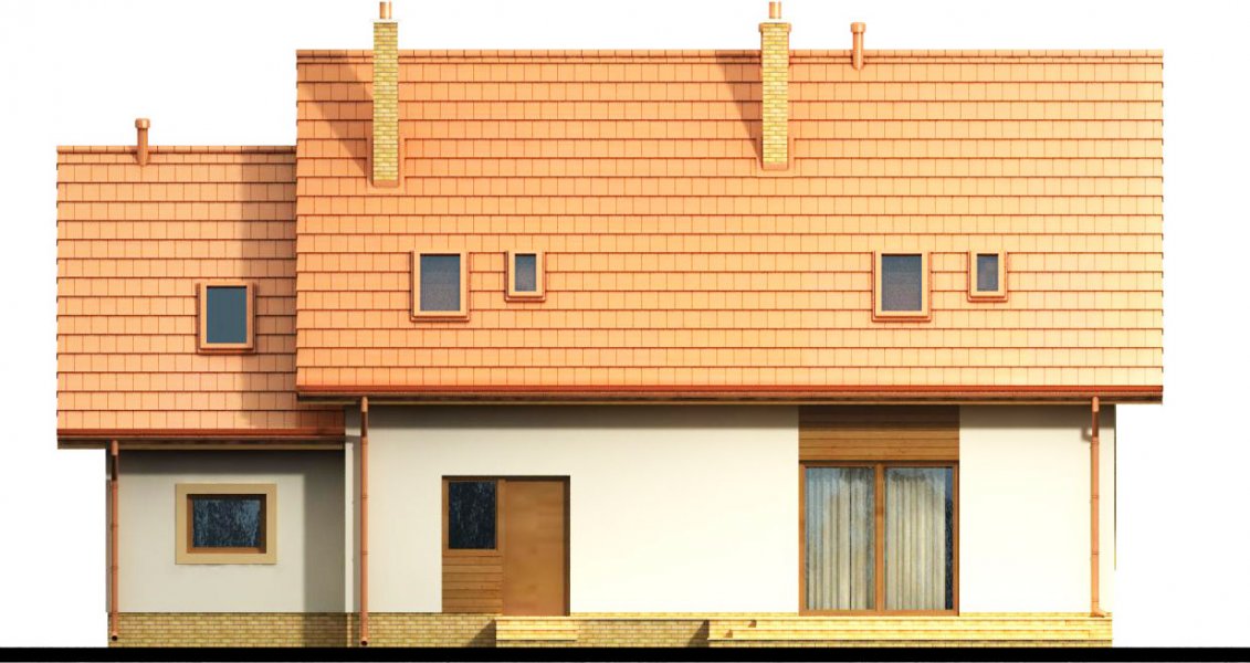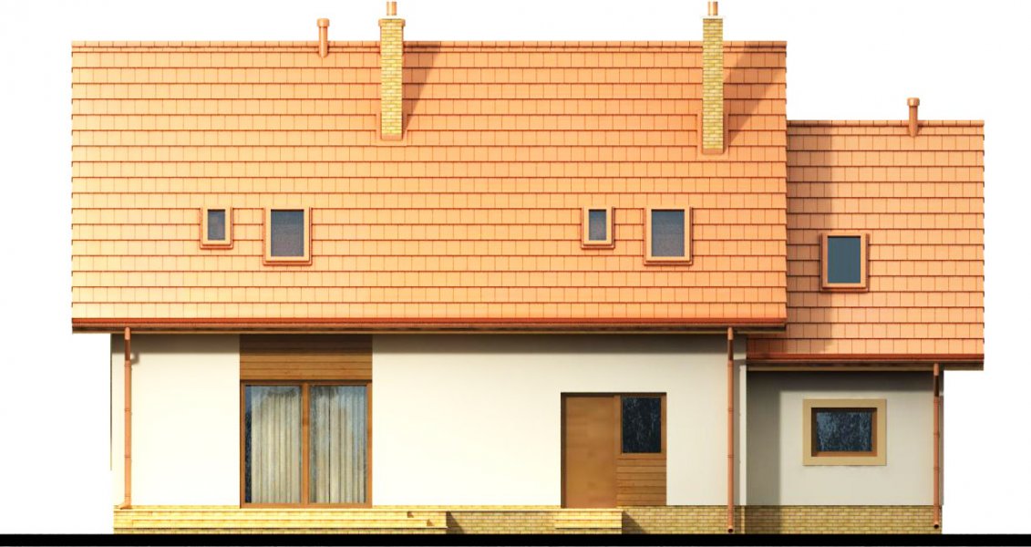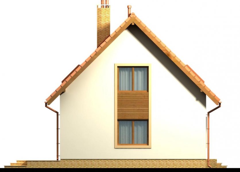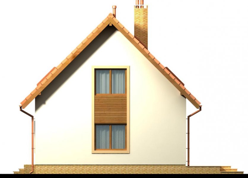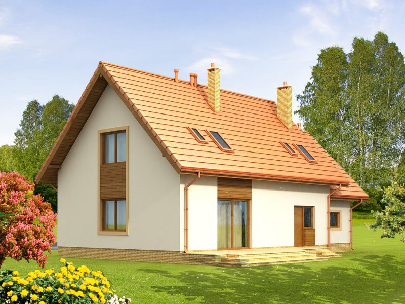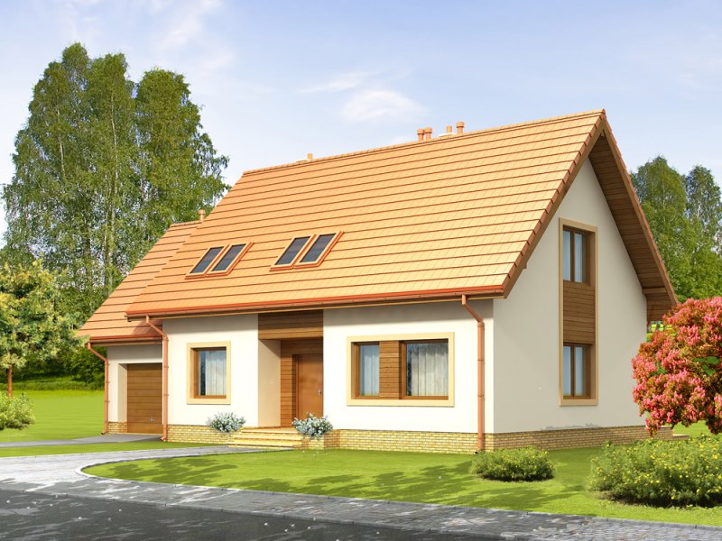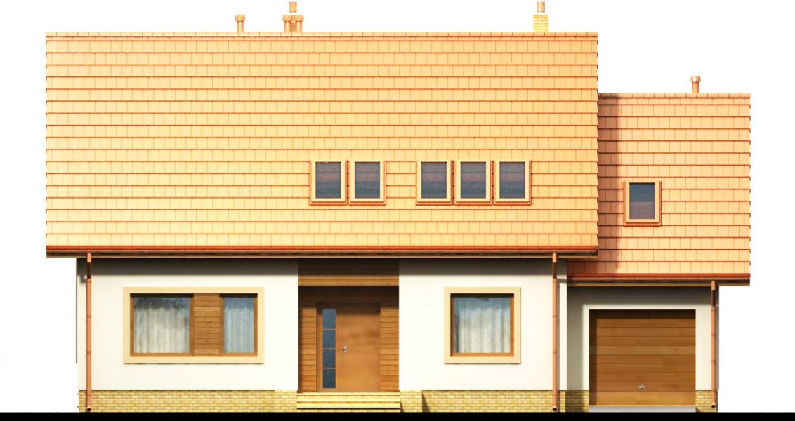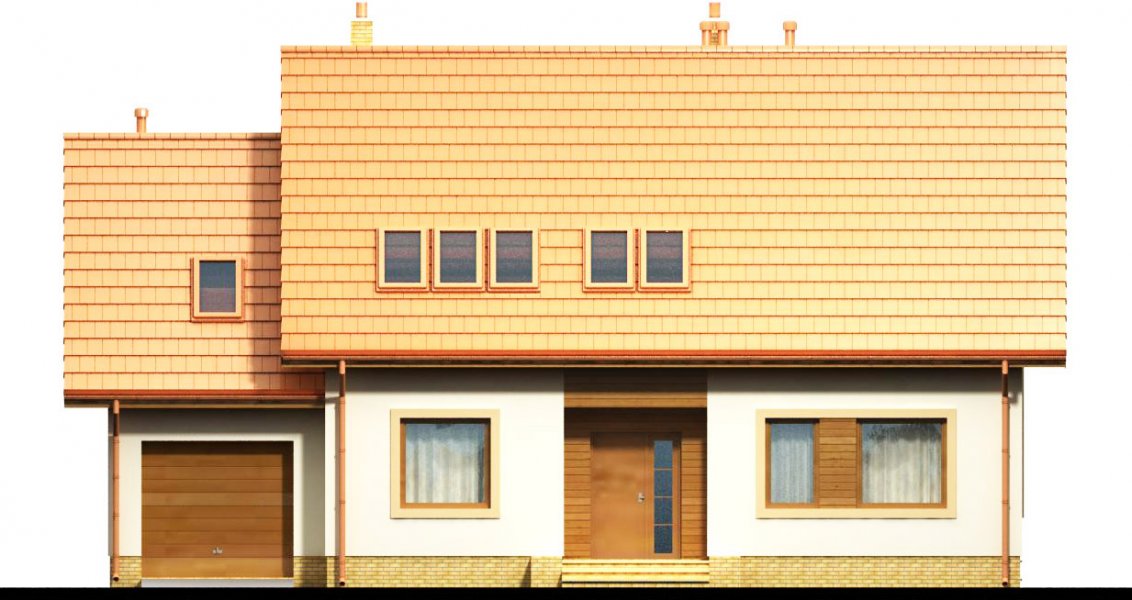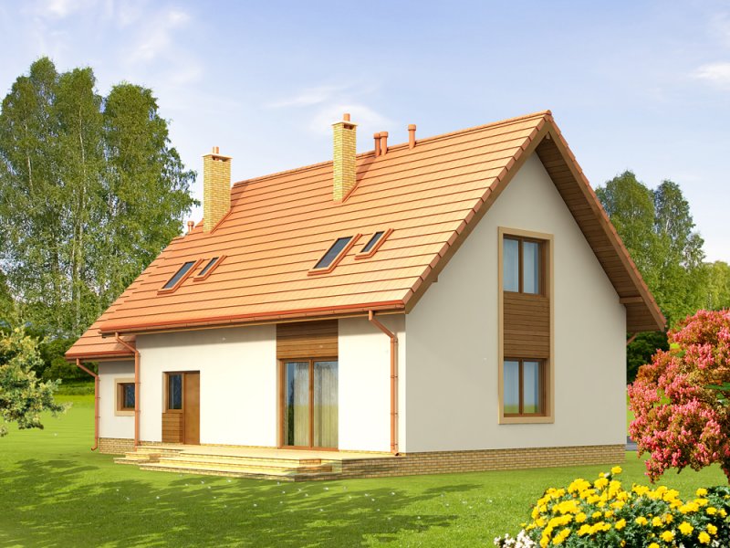 Ciekawy detal architektoniczny i ciepła kolorystyka elewacji - zawarte w prostej formie , sprawiają że dom ma atrakcyjny wygląd, a do tego jest prosty i tani w budowie.