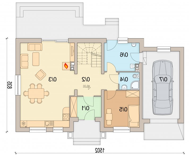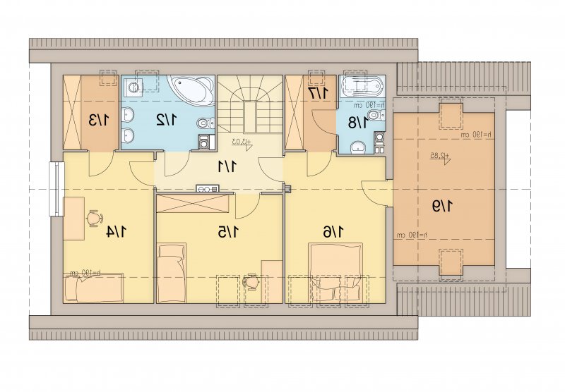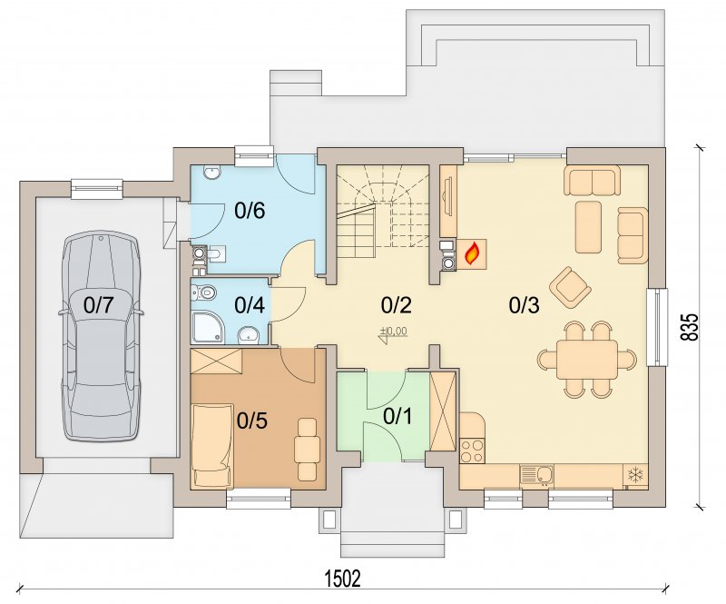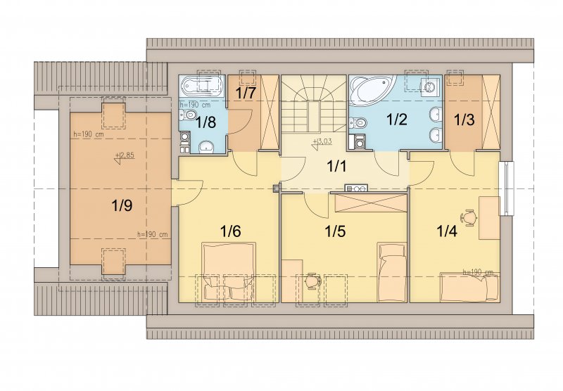 Główne zalety projektu to: sypialnia z własną garderobą i łazienką, duży salon z kuchnią, wiatrołap z miejscem na szafę, pokój gościnny na parterze, sypialnia z garderobą, duży strych, duży garaż, wysoka ściana kolankowa, która zapewni maksymalne wykorzystanie przestrzeni na poddaszu, pom. gospodarcze z wyjściem na ogród, prosta i ekonomiczna konstrukcja domu.