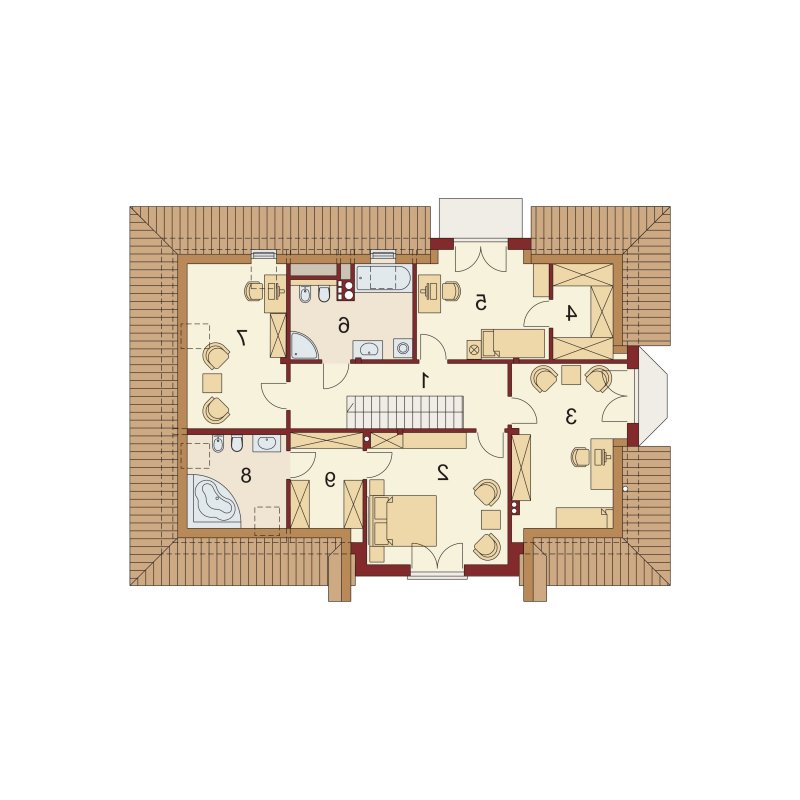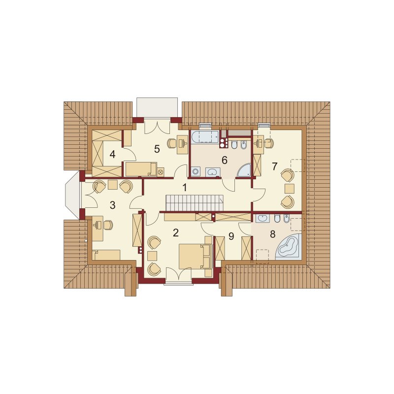 Poddasze jest miejscem wypoczynku. Pozwolą na to trzy wygodne sypialnie, dwie łazienki zachwycające swoją funkcjonalnością i przestronnością oraz dwie garderoby. Zaletą łazienki dostępnej z sypialni rodziców jest nie tylko jej intymny charakter, ale także połączenie z aneksem na pralnię z suszarnią. Ogólnodostępna garderoba w korytarzu to wygodne rozwiązanie dla domowników.