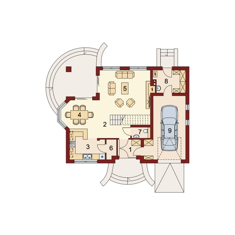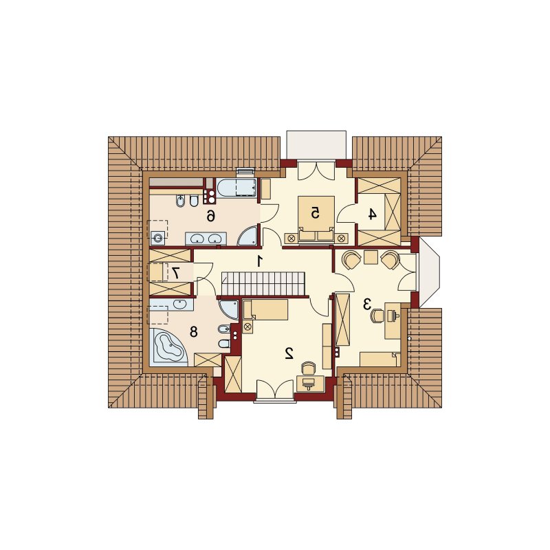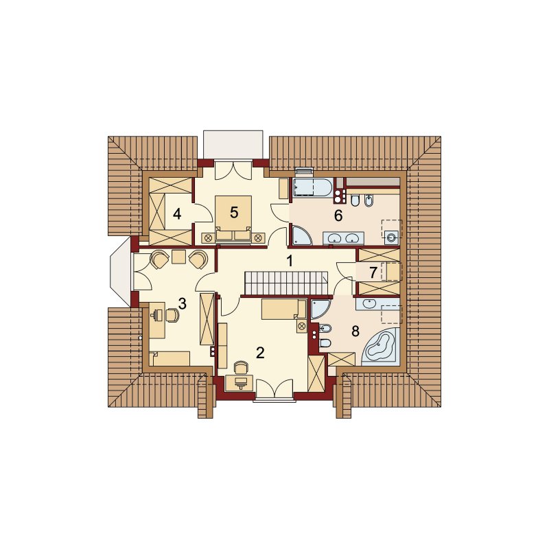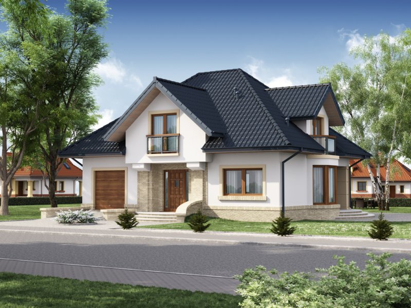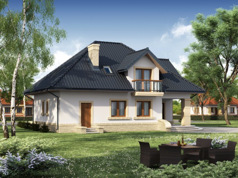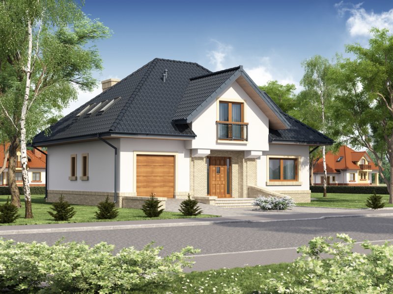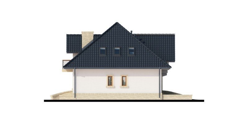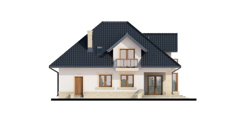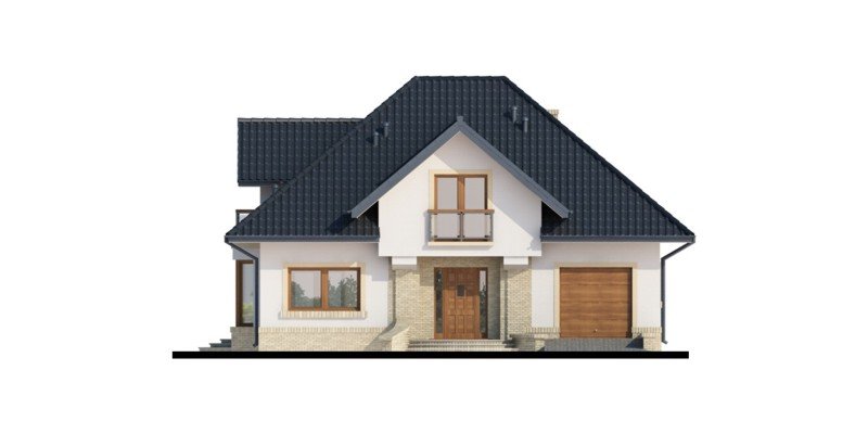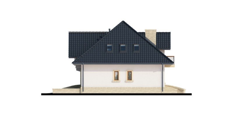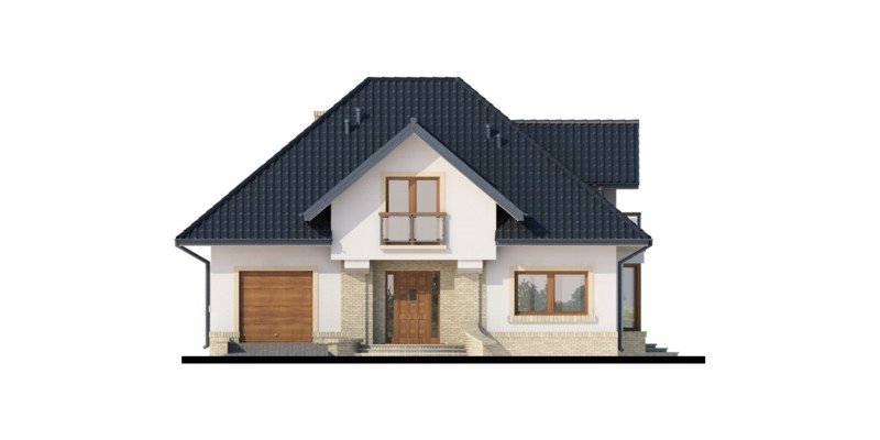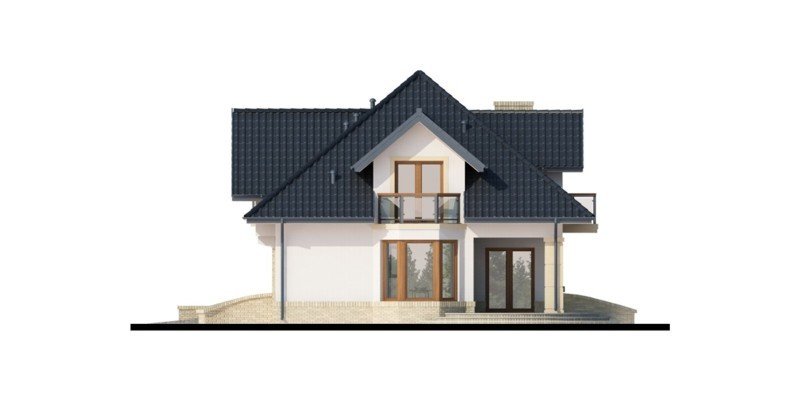 Tradycyjny dom z poddaszem użytkowym, który już na pierwszy rzut oka przyciąga swoją elegancją, a równocześnie daje wrażenie przytulności. Doskonale będzie się w nim czuła 4-osobowa rodzina. Zaletą a zarazem cechą charakterystyczną domu jest otwarta przestrzeń, która z pewnością pozwala nam na pełne odprężenie i relaks po wyczerpującym dniu. Duża ilość przeszkleń w jadalni oraz w salonie sprawia, iż dom jest słoneczny i ciepły. Taras w podcieniu posiada dwa oddzielne wejścia: do salonu i jadalni. Z pewnością zwiększy to wygodę oraz swobodę przemieszczania się mieszkańców. Dobrze doświetlona, otwarta kuchnia urzeka nas ilością blatów roboczych, miejscem na szafki wiszące oraz wbudowanym praktycznym pomieszczeniem przeznaczonym na spiżarnię. Wiatrołap scala część dzienną domu z częścią gospodarczą. Dodatkowe pomieszczenie gospodarcze dostępne z garażu, to równocześnie bezpośrednie wyjście do ogrodu. Poddasze jest miejscem wypoczynku. Pozwolą na to trzy wygodne sypialnie, dwie łazienki zachwycające swoją funkcjonalnością i przestronnością oraz dwie garderoby. Zaletą łazienki dostępnej z sypialni rodziców jest nie tylko jej intymny charakter, ale także połączenie z aneksem na pralnię z suszarnią. Ogólnodostępna garderoba w korytarzu to wygodne rozwiązanie dla domowników.