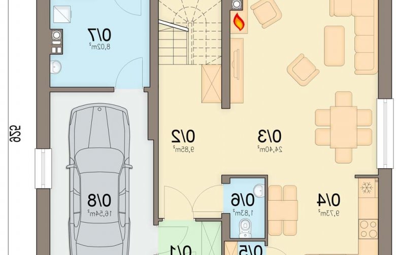 Na parterze przewidziano otwarty salon z miejscem na jadalnię, oraz dużą kuchnię.