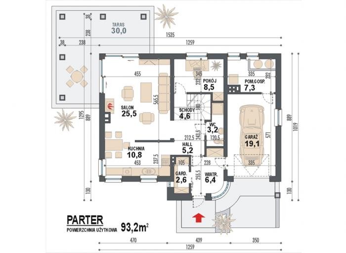 Na parterze zaprojektowano salon z kominkiem , kuchnię , aneks jadalny otwarty na salon, pokój(gabinet), łazienkę, hall, wiatrołap z wydzieloną garderobą, kotłownię oraz garaż