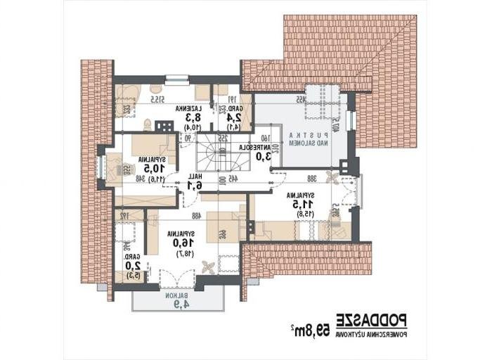 Na poddaszu użytkowym zaprojektowano 3 sypialnie oraz łazienkę i garderobę