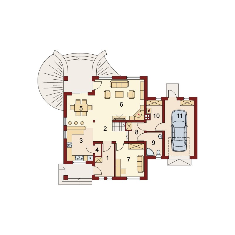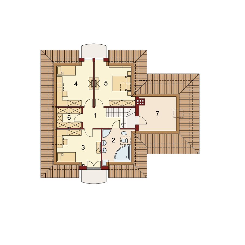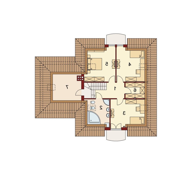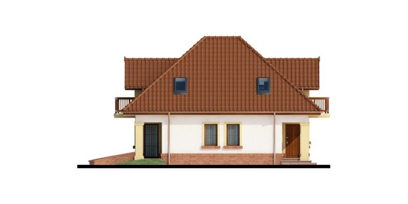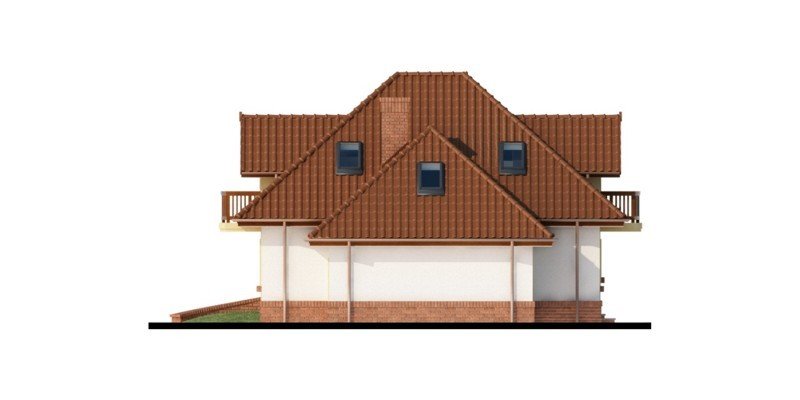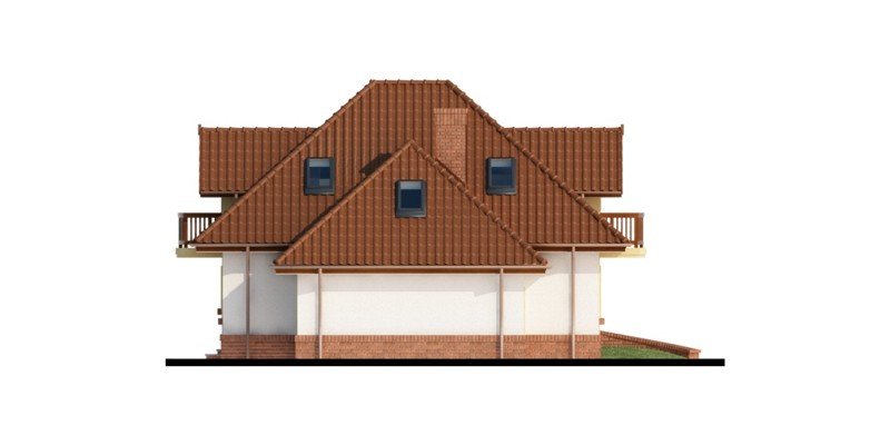 Wymarzony dom dla 4-5 osobowej rodziny. Pomieszczenia usytuowane na parterze idealnie ze sobą współgrają. Umieszczenie spiżarni w sąsiedztwie z kuchenką oraz zlewozmywakiem tworzy praktyczną strefę roboczą w kuchni. Garderoba łączy część mieszkalną parteru z gospodarcza, co świadczy o doskonałym wykorzystaniu przestrzeni. Dodatkowym wyjściem na taras w salonie, możemy przejść w stronę ogrodu nie zakłócając nastroju biesiadników w jadalni. Zaletą jest również bezpośrednie wejście w elewacji ogrodowej do strefy gospodarczej . Dzięki niemu możemy dostać się do garażu, a także łazienki bez zbędnej ingerencji w część mieszkalną domu. Również poddasze, z trzema ustawnymi pokojami oraz obszerną łazienką, urzeknie swoją funkcjonalnością. Ogólnodostępną garderobę doceni każdy domownik. Strych dostępny bezpośrednio z klatki schodowej to doskonały pomysł na dodatkowy pokój hobby lub prywatną siłownię.