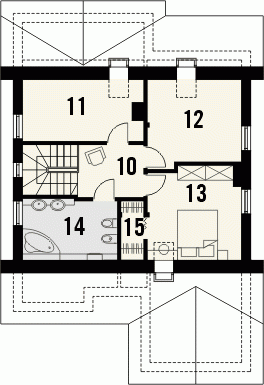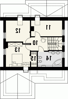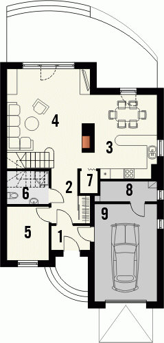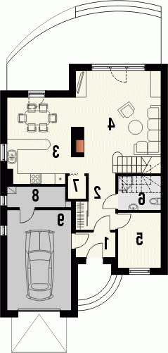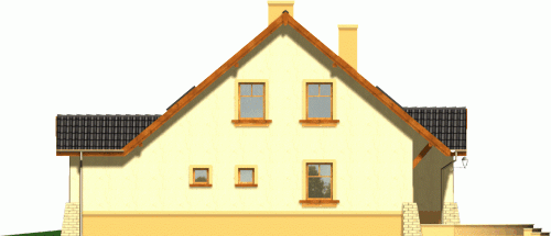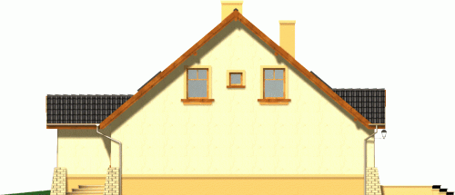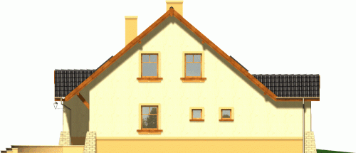 Budynek niepodpiwniczony piętrowy z garażem. Na parterze, do pokoju dziennego przylega otwarta kuchnia ze spiżarką i jadalnią. Z garażu dostępne jest pomieszczenie gospodarcze, a przy strefie wejściowej znalazł się dodatkowy pokój i łazienka. Na poddaszu znajdują się trzy sypialnie, w tym jedna z garderobą oraz przestronna łazienka. Dokumentacja dostępna również w odbiciu lustrzanym.
