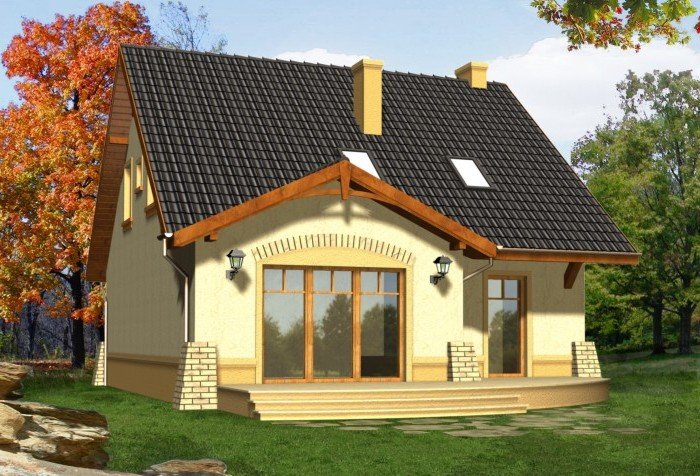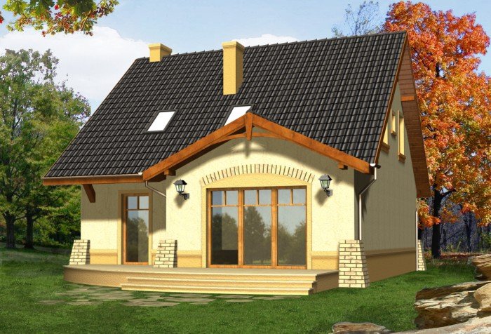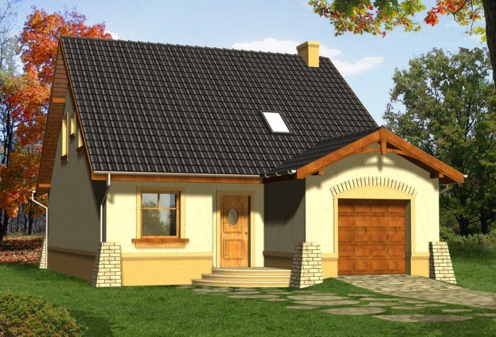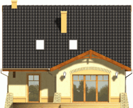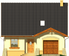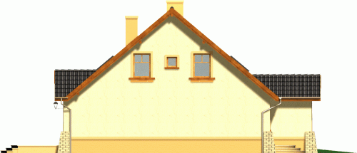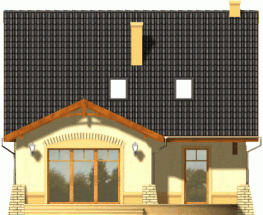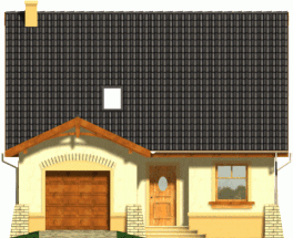 Kompaktowy dom z dachem dwuspadowym z bryłą garażu lekko wysuniętą do przodu. Od strony ogrodu do budynku przylega na całej szerokości taras. Jego główną atrakcją jest ciekawie podkreślone szczytem dachu przeszklone wyjście z pokoju dziennego.