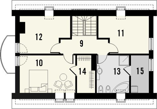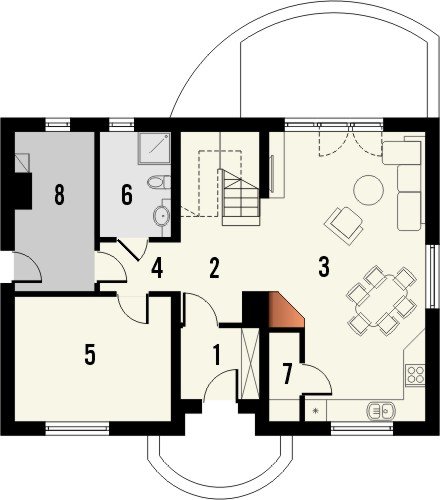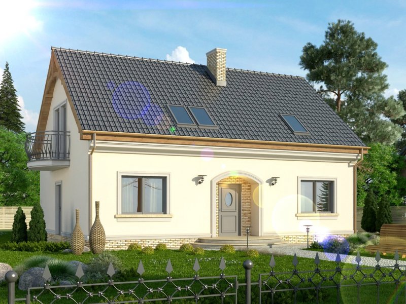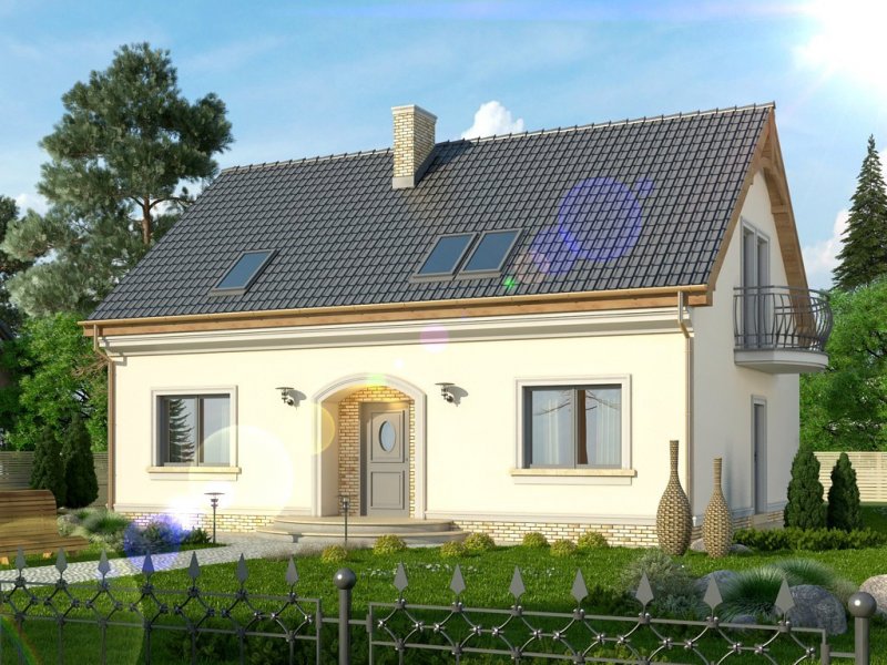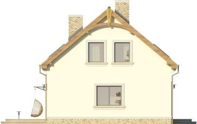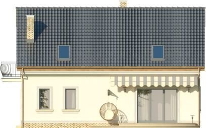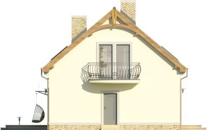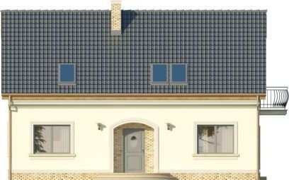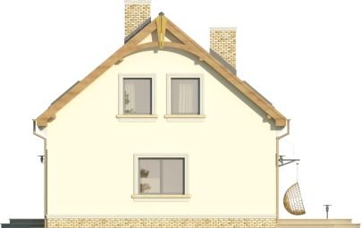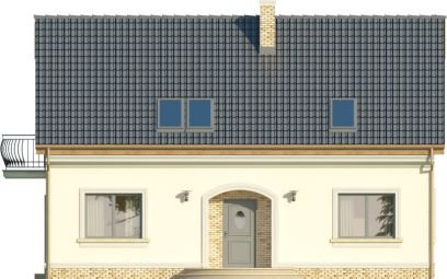 Niepodpiwniczony, piętrowybudynek bez garażu. Na parterze zaprojektowano salon oraz jadalnię,połączone z otwartą kuchnią ze spiżarką, dodatkowy pokój,łazienkę i pomieszczenie gospodarcze, dostępne z zewnątrz, jak iz wnętrza domu. Na poddaszu pod dachem stromym ulokowano trzyprzestronne sypialnie, w tym dwie z wyjściem na balkon oraz łazienkęz wydzieloną pralnią. Największa z sypialni na piętrze posiadarównież wydzieloną garderobę. Dokumentacja dostępna wstandardzie, jak i w odbiciu lustrzanym.Klasyczny, elegancki dom zdachem dwuspadowym o zwartej, ekonomicznej bryle. Uwagę zwracajądetale architektoniczne, takie jak gzymsy oraz opaski okienne.Wejście do budynku zaprojektowane w podcieniu, dzięki czemuuzyskano ponad nim zadaszenie.