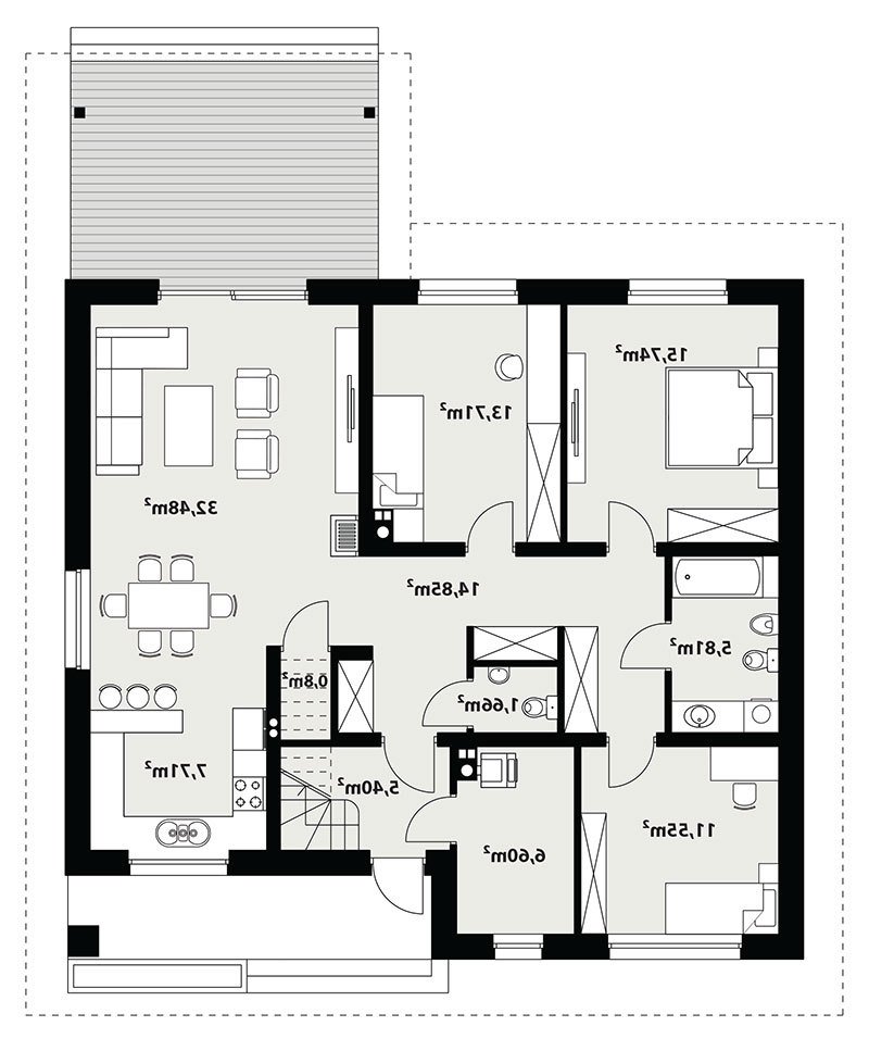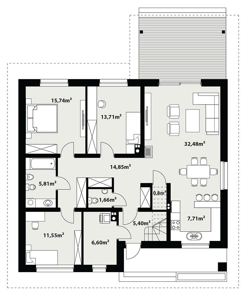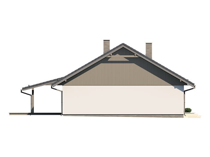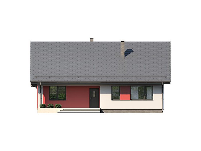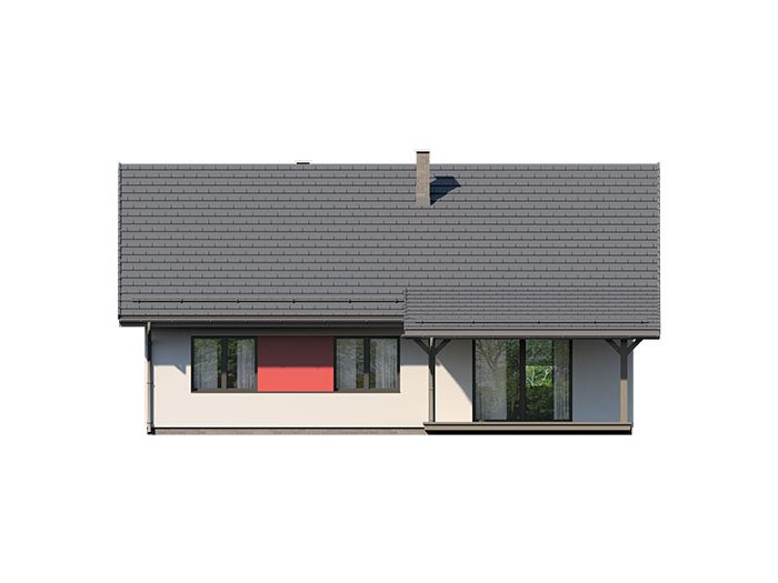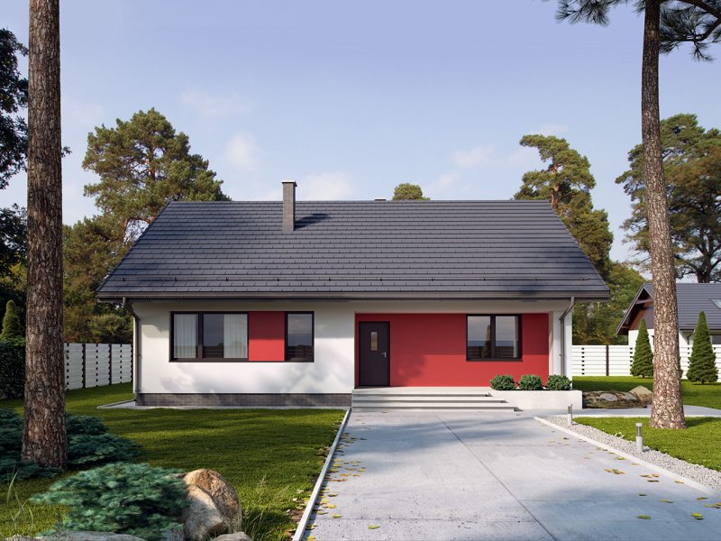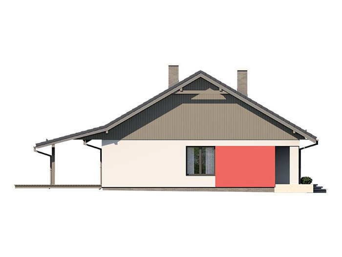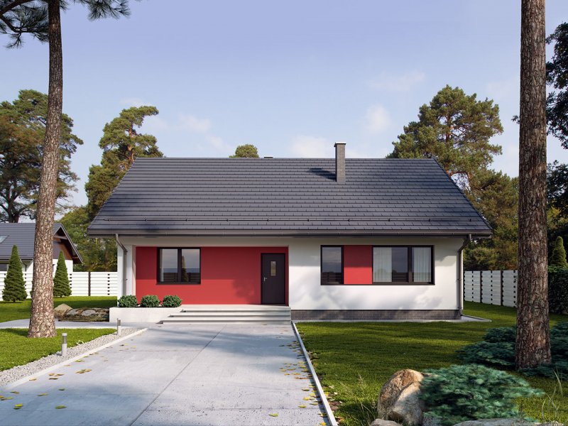 Dom jednorodzinny parterowy, z nieużytkowym poodaszem, bez garażu. Prosty i funkcjonalny. Duży salon z jadalnią posiada bezpośrednie wyjście na zadaszony taras. Kuchnia jest otwarta na salon, można ją jednak bez problemu wydzielić i zamknąć. Dom ten posiada dużo dodatkowego miejsca na szafy i schowki oraz dużą kotłownię dostępną z wiatrołapu. Wejście do domu jest przez praktyczny podcień chroniący przed deszczem i słońcem. Strych (nieużytkowy) posiada wejscie ze schodami dostępnymi z wiatrołapu. Można go zaadaptować na dodatkowe pokoje, mieszkanie czy biuro.