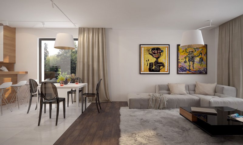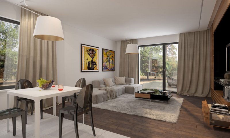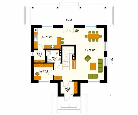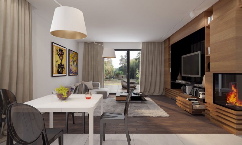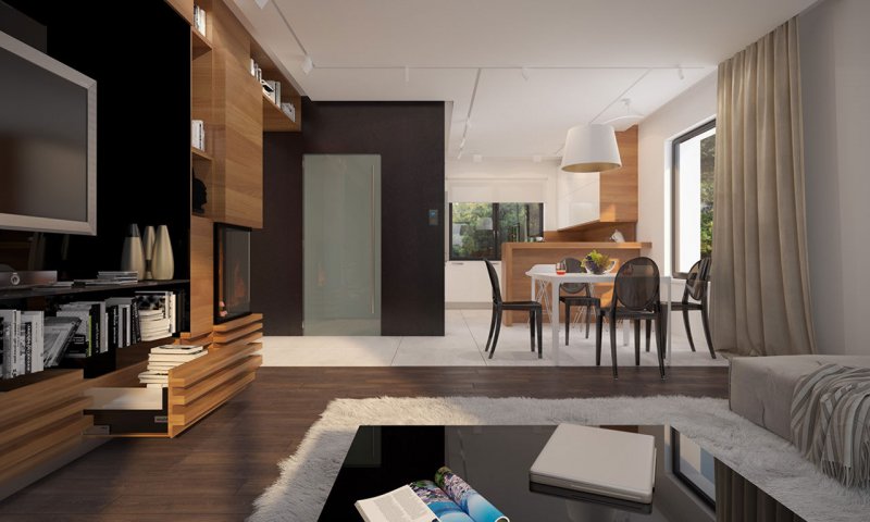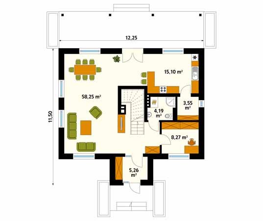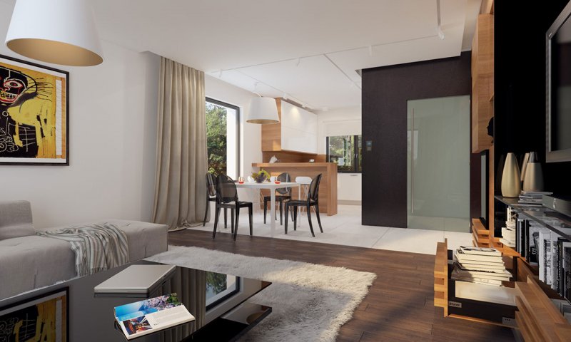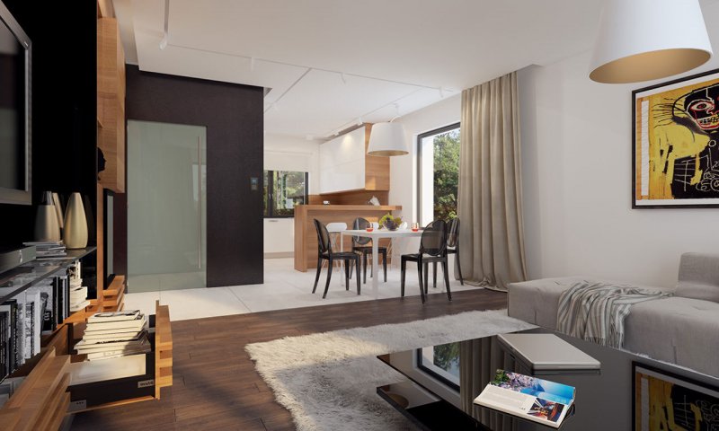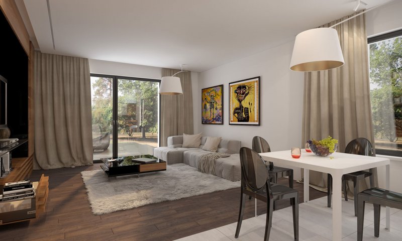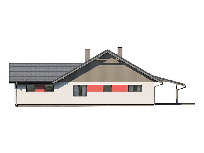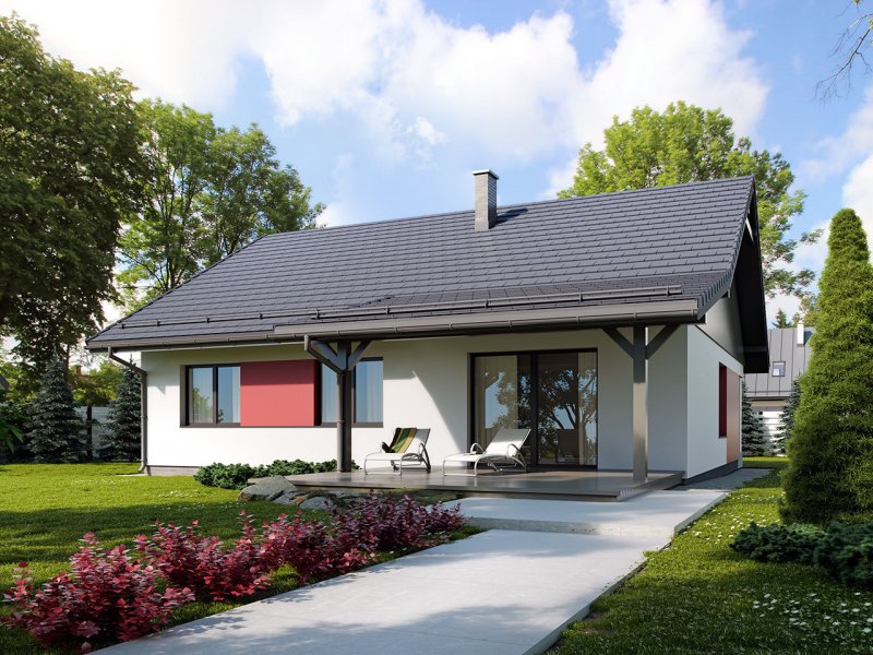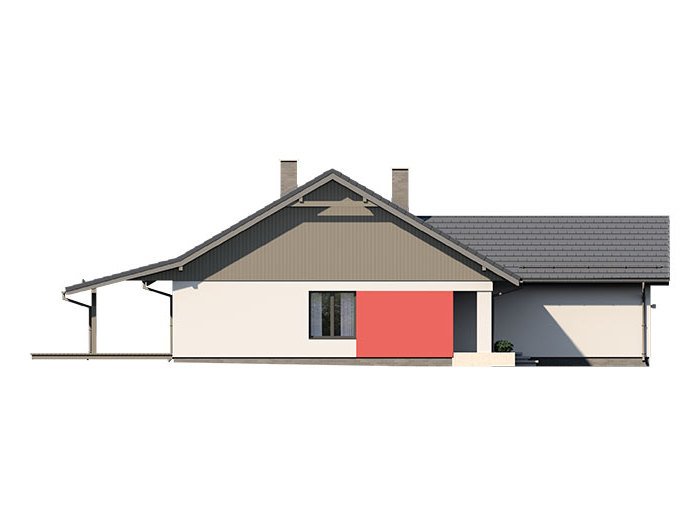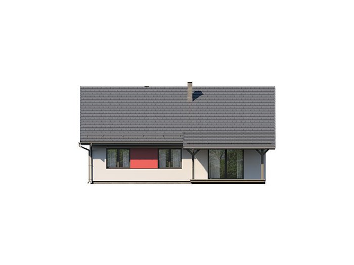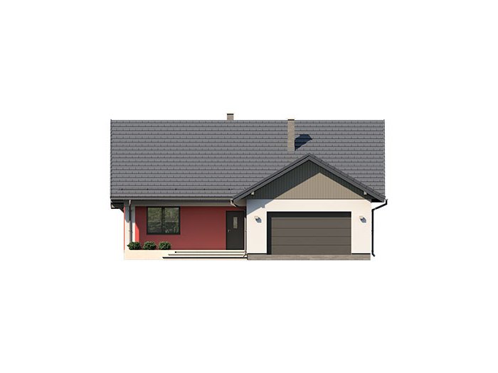 Dom jednorodzinny parterowy, z nieużytkowym poodaszem, z garażem dwustanowiskowym. Prosty i funkcjonalny. Duży salon z jadalnią posiada bezpośrednie wyjście na zadaszony taras. Kuchnia jest otwarta na salon, można ją jednak bez problemu wydzielić i zamknąć. Dom ten posiada dużo dodatkowego miejsca na szafy i schowki oraz dużą kotłownię dostępną z wiatrołapu. Wejście do domu jest przez praktyczny podcień chroniący przed deszczem i słońcem. Strych (nieużytkowy) posiada wejscie ze schodami dostępnymi z wiatrołapu. Można go zaadaptować na dodatkowe pokoje, mieszkanie czy biuro.