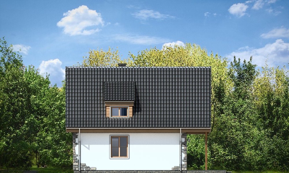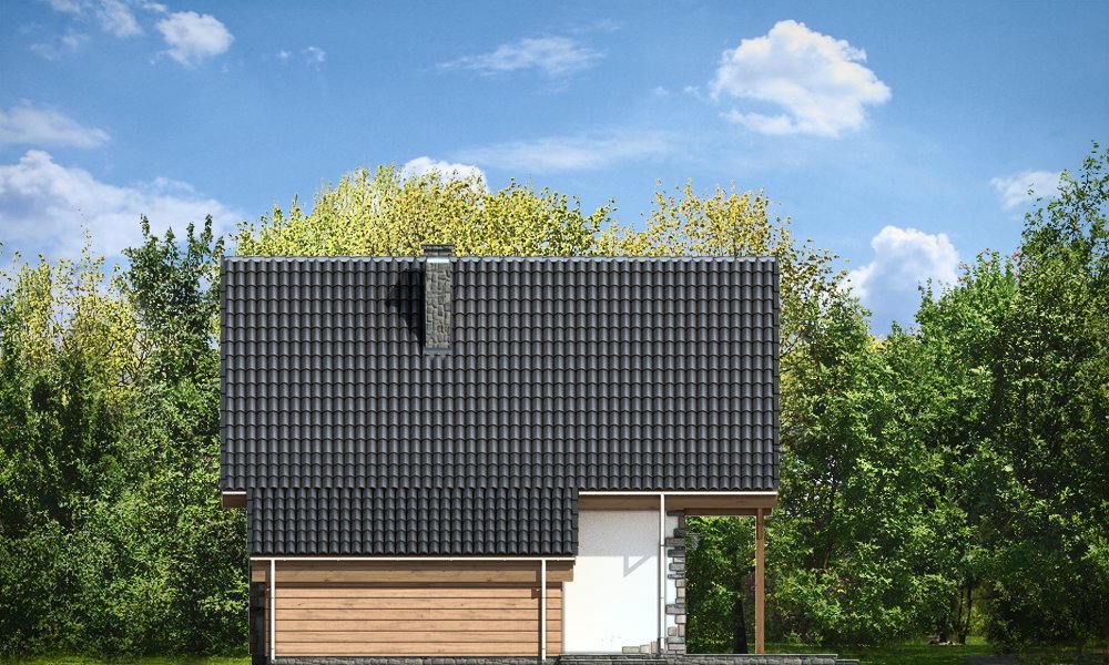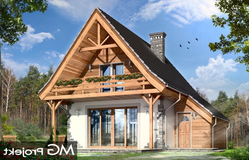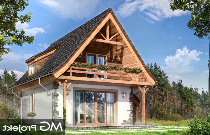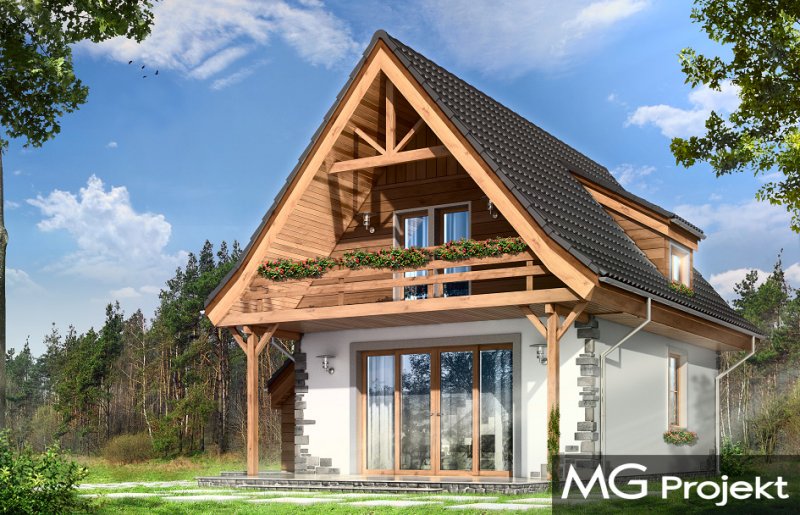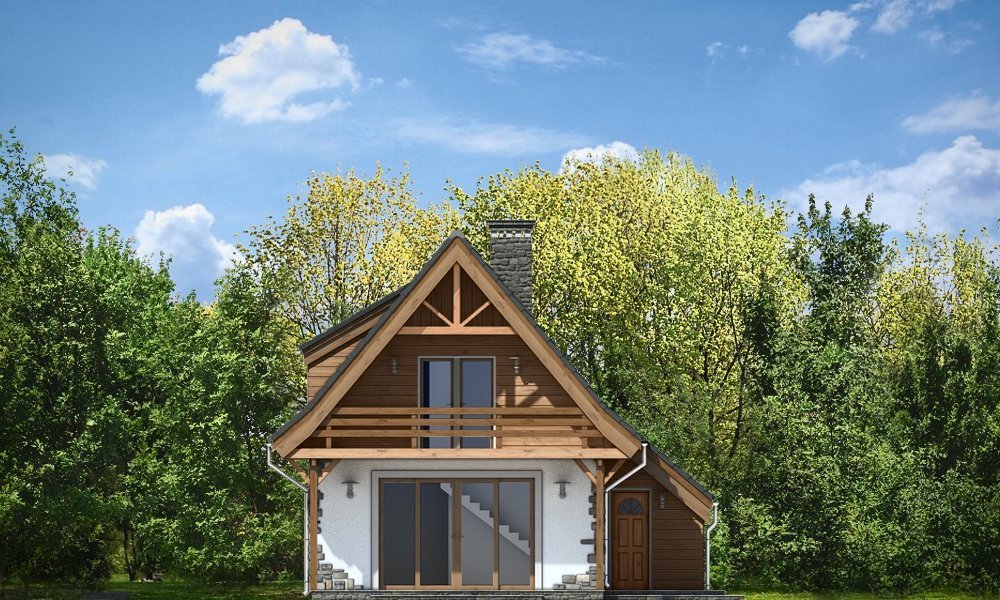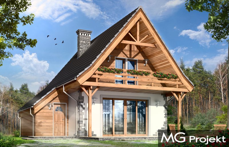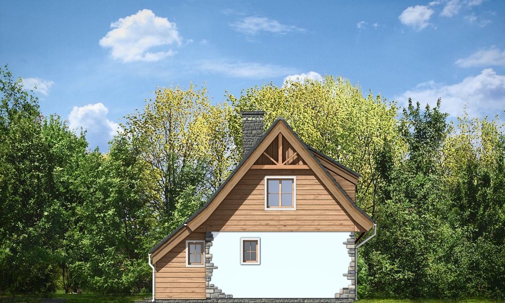 Projekt domu Chatka 2 stanowi powiększoną wersję popularnego projektu Chatka. Dom Chatka 2 jest domem jednorodzinnym dla 3-4 osobowej rodziny. Dom Chatka 2 może służyć również jako domek letniskowy. Bryła budynku, przekryta jest stromym dwuspadowym dachem. Duży balkon i zadaszony taras od strony ogrodowej, oraz szerokie przeszklone wyjście z salonu dają fantastyczny efekt otwarcia na ogród. Duża ilość drewna w elewacji oraz kamienne okładziny - to delikatne nawiązanie do architektury podhalańskiej. Jednocześnie dom ma na tyle delikatną linię, że nie będzie raził swoim wyglądem postawiony na przykład na Mazurach. We wnętrzu domu Chatka 2 zaprojektowano na parterze duży salon z wyeksponowanymi schodami i kominkiem, półotwartą kuchnię, łazienkę, kotłownię z piecem centralnego ogrzewania i przedsionek. Na poddaszu zaplanowano trzy niewielkie sypialnie, oraz przydatne wc. Pracownia posiada również wersję odbicia lustrzanego projektu.