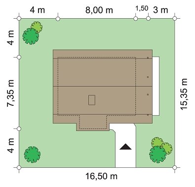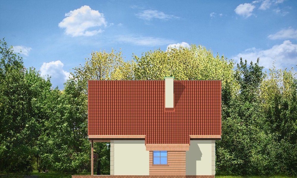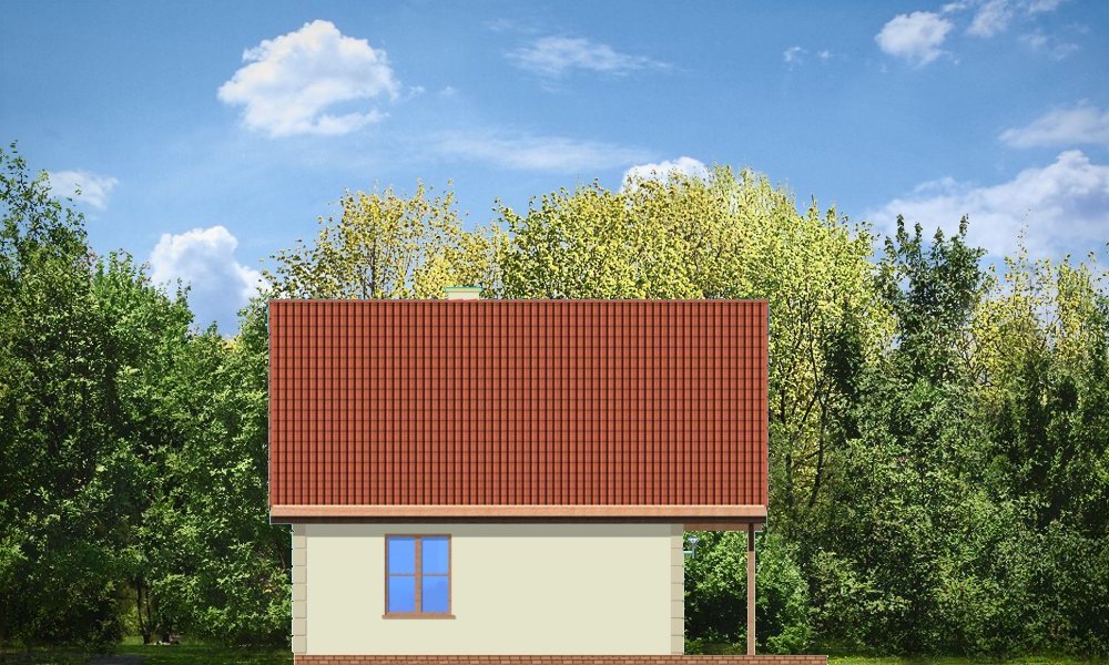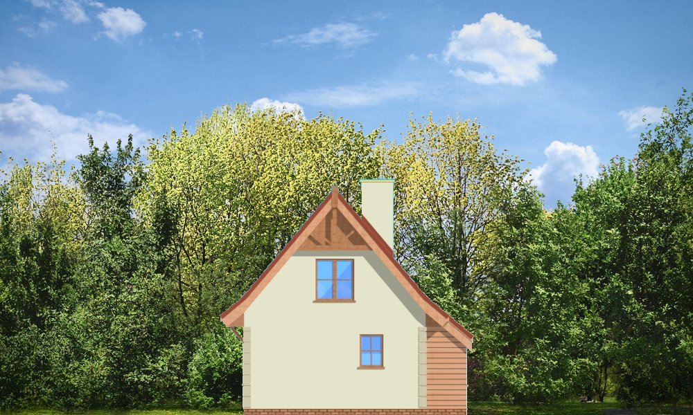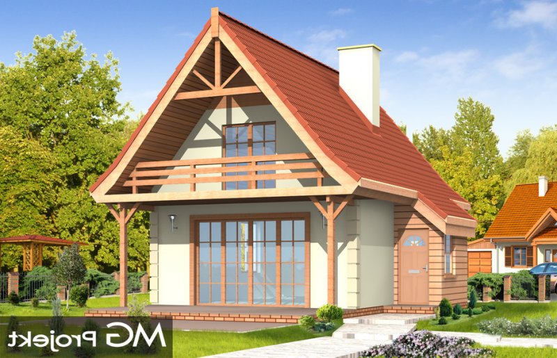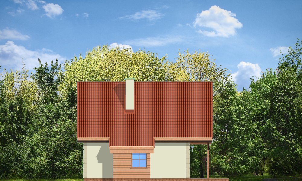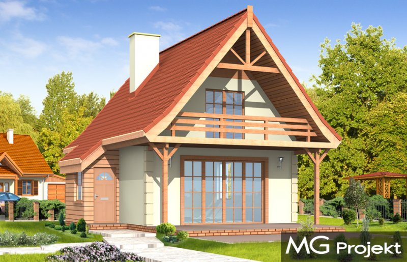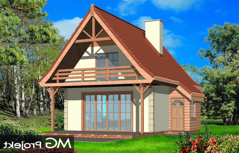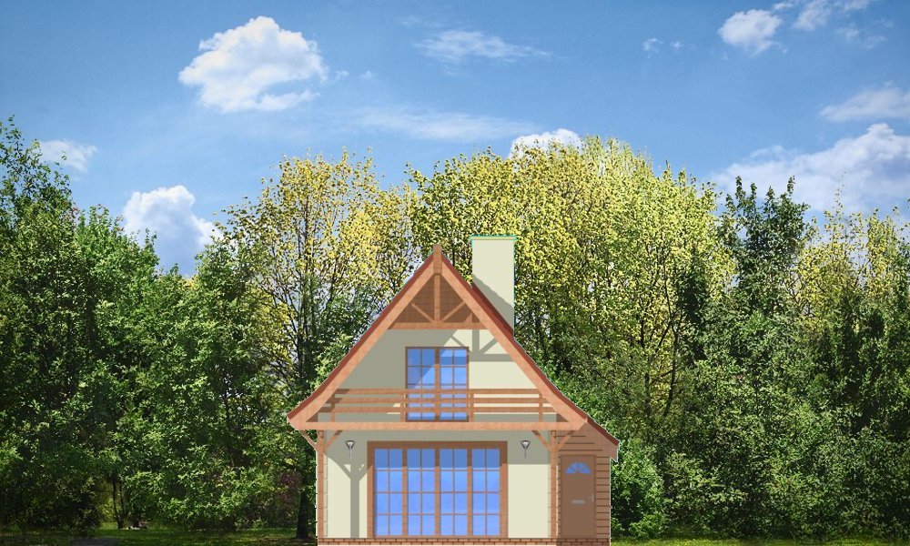 Chatka to wymarzony dom na działkę rekreacyjną lub do całorocznego zamieszkania dla małej rodziny. Domek mimo niewielkiej powierzchni mieści w sobie wszystkie potrzebne pomieszczenia: na parterze wygodny salon z kominkiem, kuchnią i łazienką, na poddaszu 2 lub 3 sypialnie. W projekcie zaplanowano dodatkowe wejście z dobudowanego ganku, co pozwala na umieszczenie drzwi wejściowych z przodu lub z tyłu domu. Pod dużym podcieniem wiszącym nad tarasem można schronić się przed deszczem lub słońcem, zaś z wygodnego balkonu podziwiać piękną okolicę.