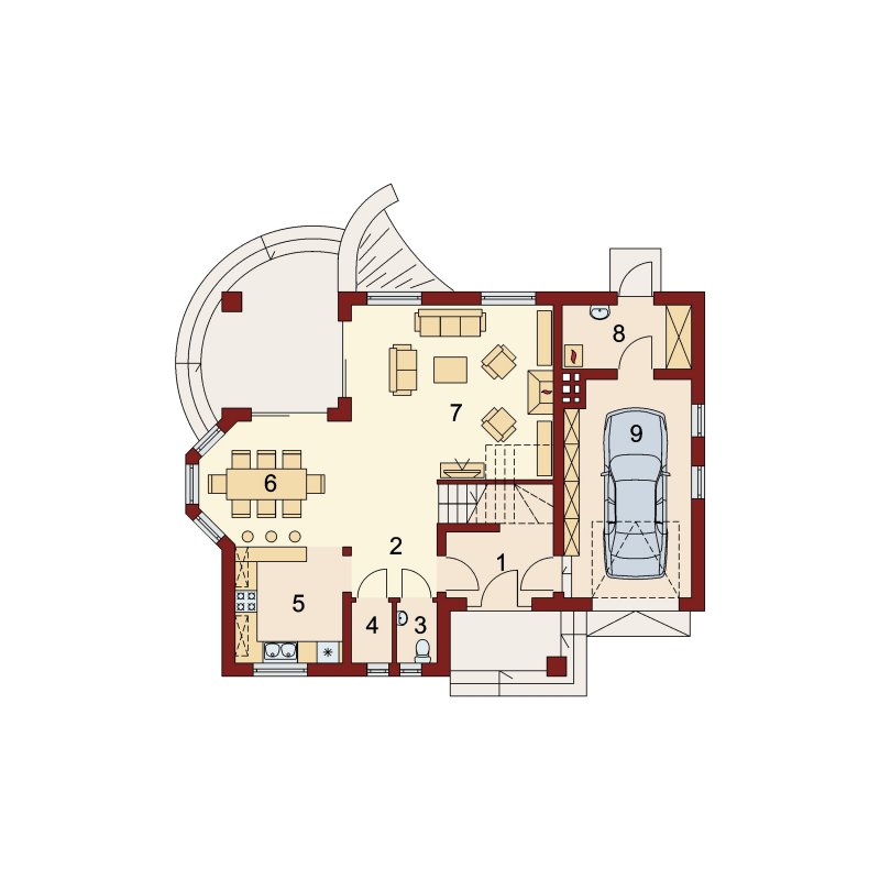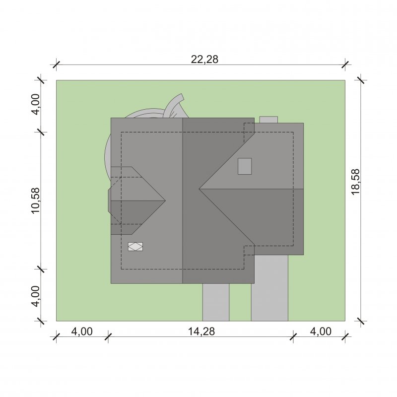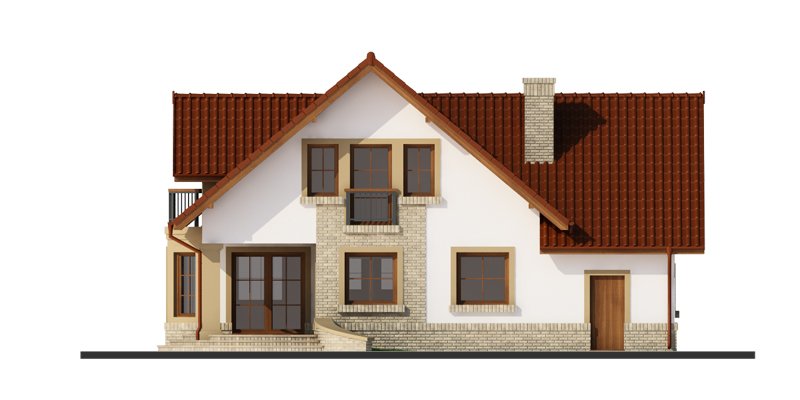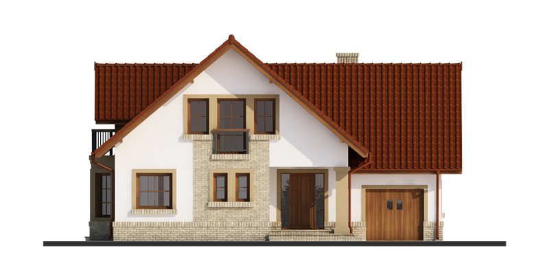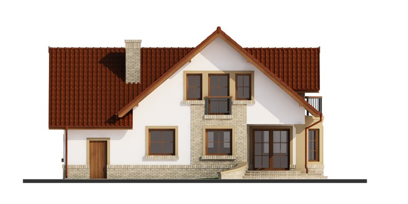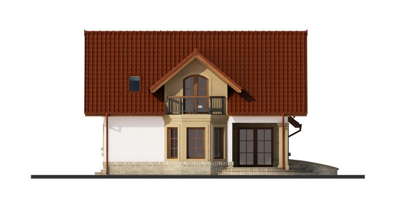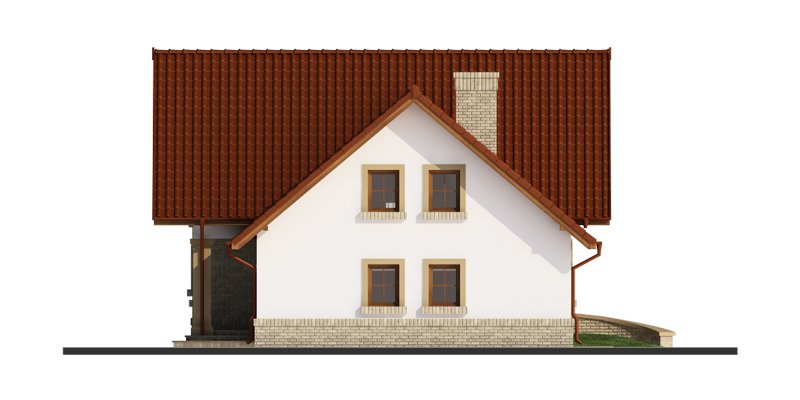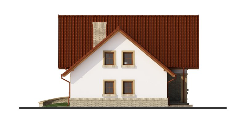 Dom z poddaszem użytkowym, przeznaczony dla 4-osobowej rodziny. Na parterze znajduje się przestronny pokój dzienny połączony z jadalnią i otwartą kuchnią. Rozwiązanie funkcjonalne pozwala na wydzielenie ww. pomieszczeń. Wyjście na taras z podcieniem jest możliwe zarówno z części wypoczynkowej pokoju dziennego jak i z części przeznaczonej na jadalnie. W bliskim sąsiedztwie kuchni dostępna jest spiżarnia oraz pomieszczenie WC. Na parterze znajduje się pomieszczenie gospodarcze, dostępne z garażu i bezpośrednio z ogrodu. Na poddaszu znajdują się trzy sypialnie, garderoba dostępna z pokoju, łazienka oraz pomieszczenie strychu. Istnieje możliwość zaadaptowania strychu na pokój.