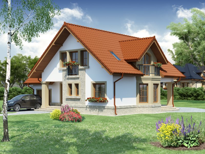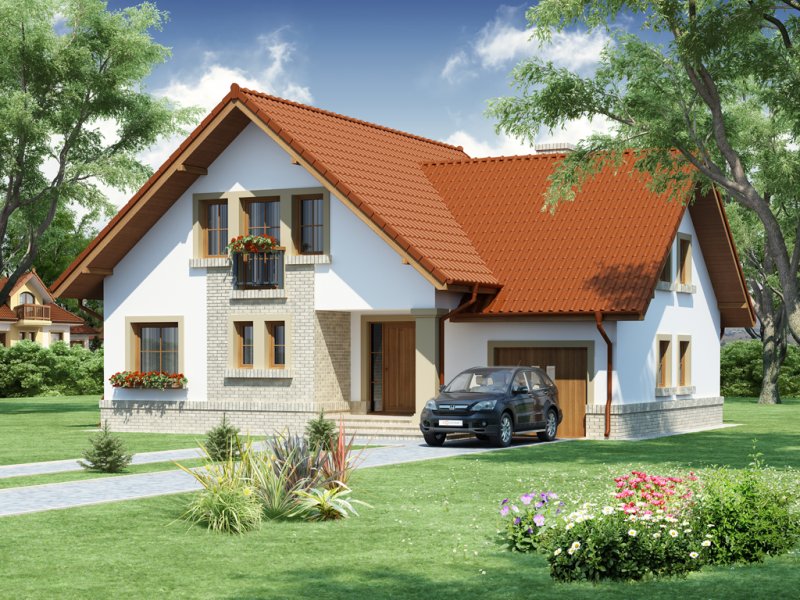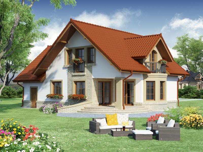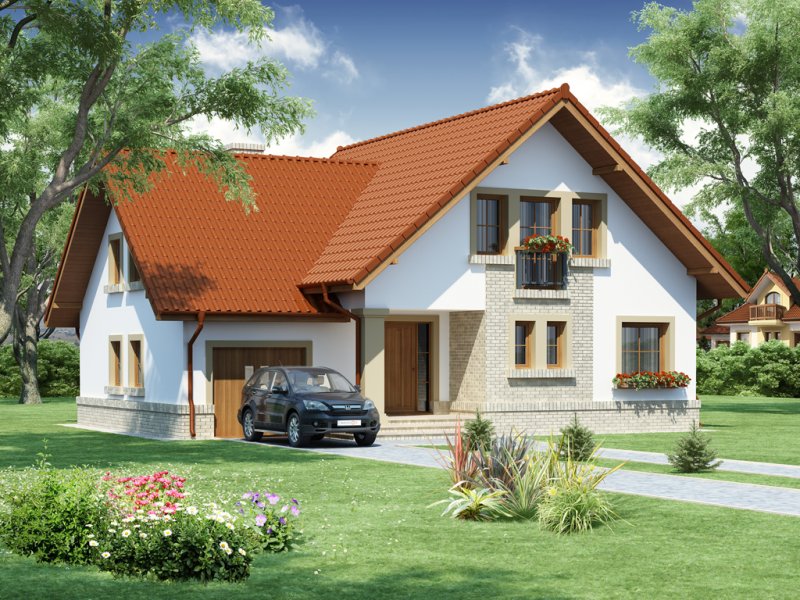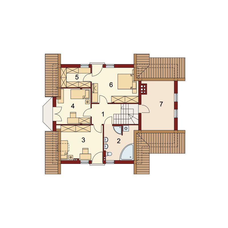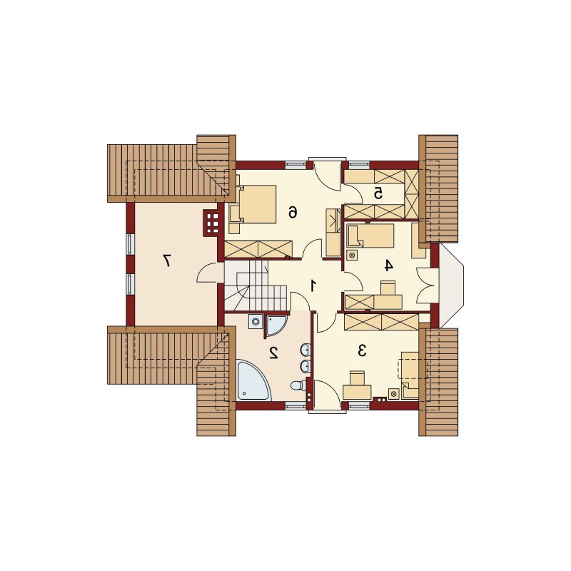 Dom z poddaszem użytkowym, przeznaczony dla 4-osobowej rodziny. Na parterze znajduje się przestronny pokój dzienny połączony z jadalnią i otwartą kuchnią. Rozwiązanie funkcjonalne pozwala na wydzielenie ww. pomieszczeń. Wyjście na taras z podcieniem jest możliwe zarówno z części wypoczynkowej pokoju dziennego jak i z części przeznaczonej na jadalnie. W bliskim sąsiedztwie kuchni dostępna jest spiżarnia oraz pomieszczenie WC. Na parterze znajduje się pomieszczenie gospodarcze, dostępne z garażu i bezpośrednio z ogrodu. Na poddaszu znajdują się trzy sypialnie, garderoba dostępna z pokoju, łazienka oraz pomieszczenie strychu. Istnieje możliwość zaadaptowania strychu na pokój.