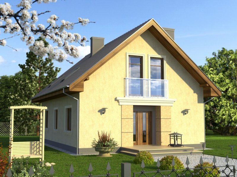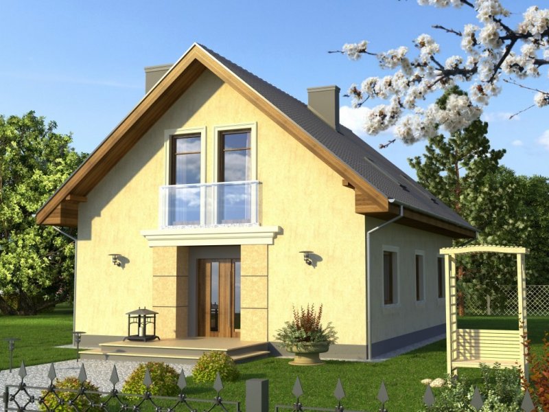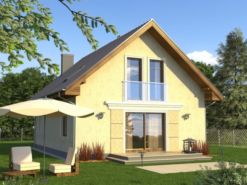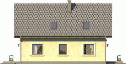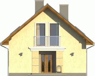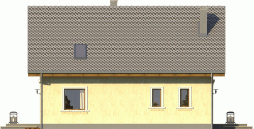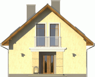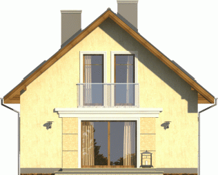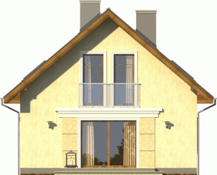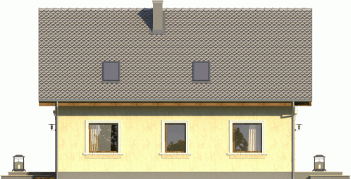 Tani w realizacji i ekonomiczny w utrzymaniu dom z dachem dwuspadowym. Uwagę zwracają symetryczne fasady, z wejściem osłoniętym podcieniem i przeszklonym szczytem od ogrodu. Widoczne od zewnątrz gzymsy, opaski i boniowania dodają temu domowi dodatkowego uroku.