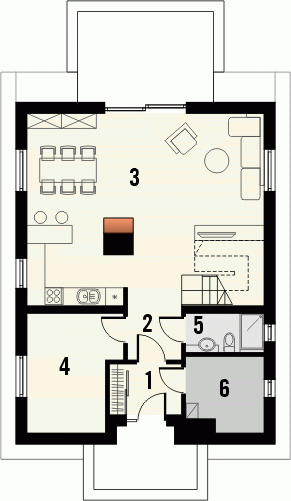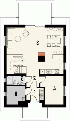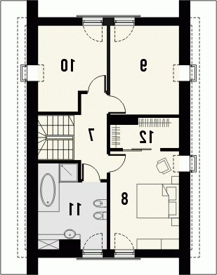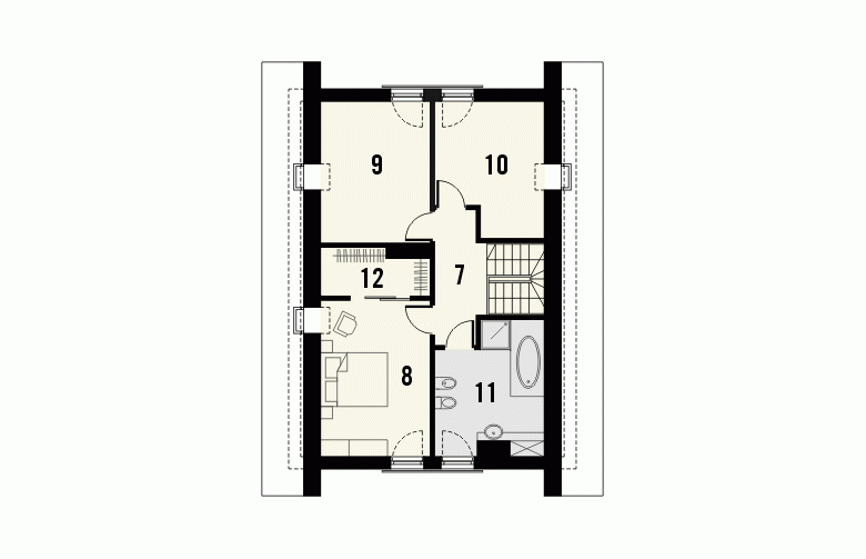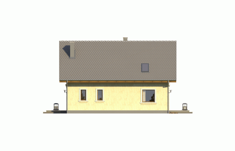 Budynek niepodpiwniczony, piętrowy bez garażu. Parter mieści przestronny salon połączony z kuchnią, dodatkowy pokój, wc i pomieszczenie gospodarcze. Na poddaszu pod dachem stromym ulokowano 3 sypialnie, w tym jedną z garderobą oraz widną łazienkę. Dokumentacja dostępna również w odbiciu lustrzanym.