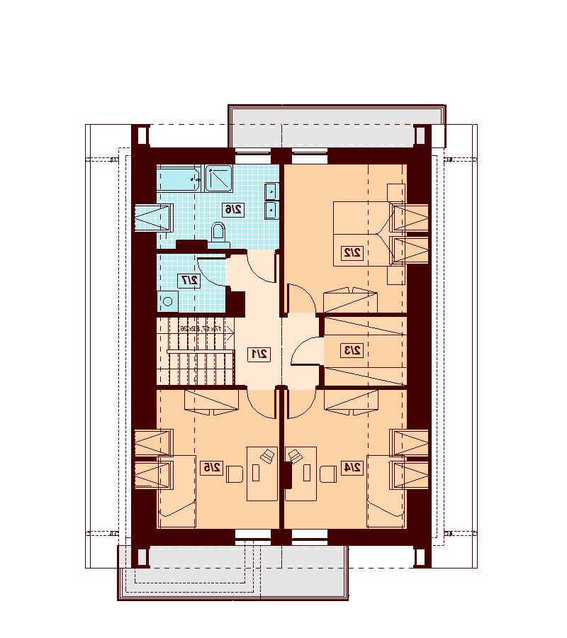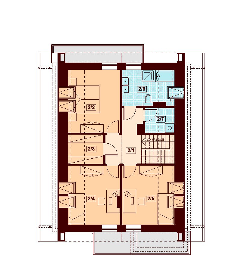 W domu Diona Mała Bis pomiędzy kondygnacjami zaprojektowano strop gęstożebrowy. Poddasze to bardziej zaciszna, przytulna część domu. Na domowników czekają tutaj trzy ustawne sypialnie; wszystkie z dostępem do balkonów. U góry zaplanowano także rodzinną łazienkę, pralnię oraz ogólnodostępną garderobę.